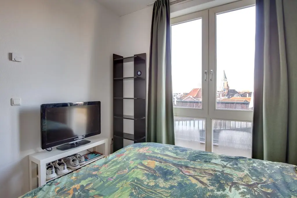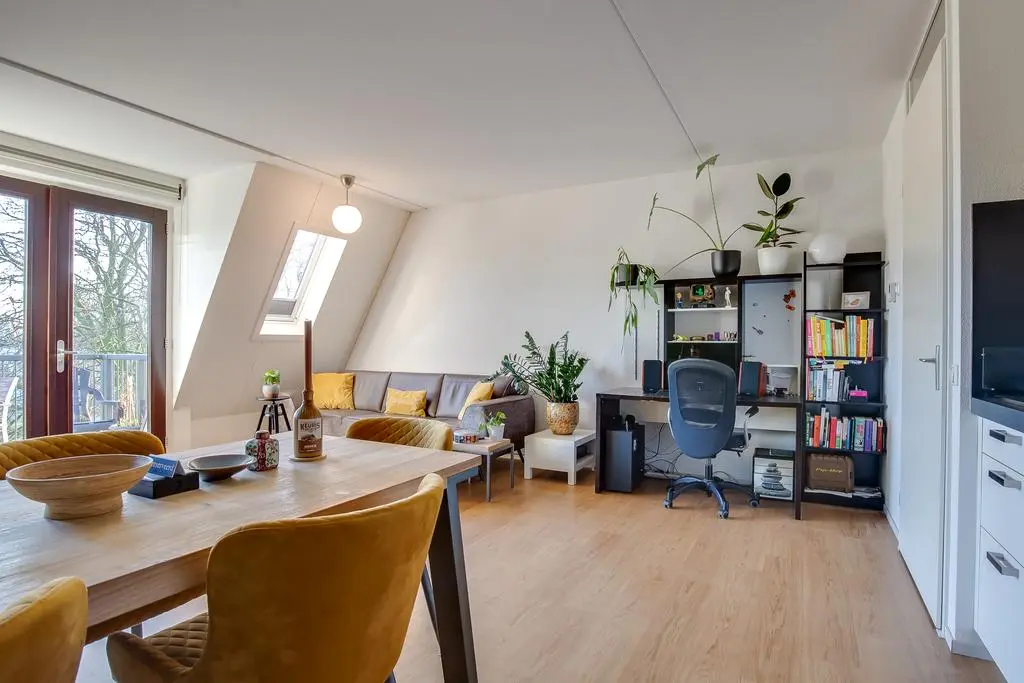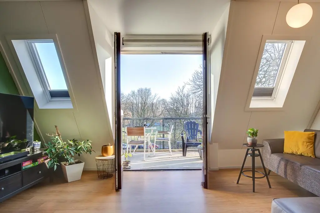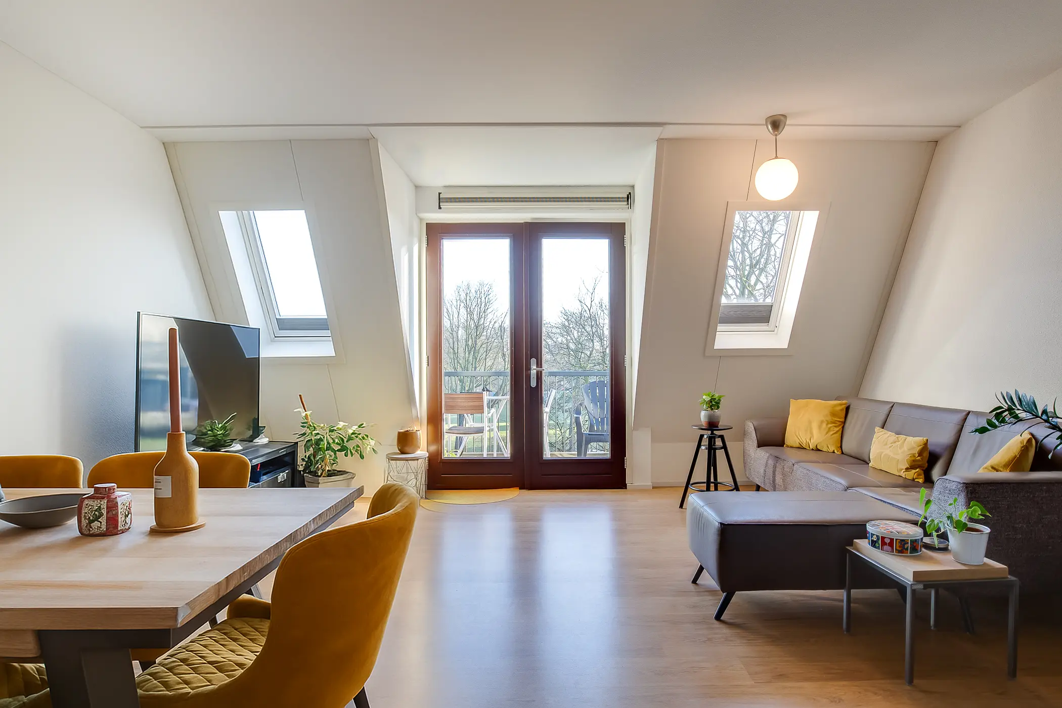 De hoge raampartijen en de openslaande deuren naar het balkon zorgen voor veel licht in het appartement.