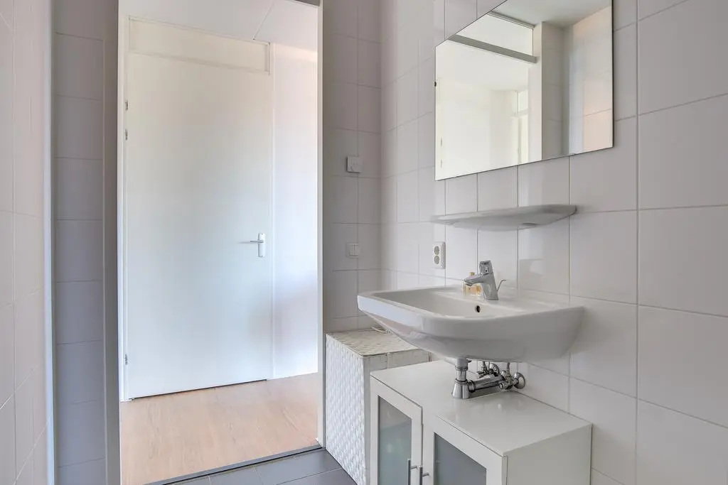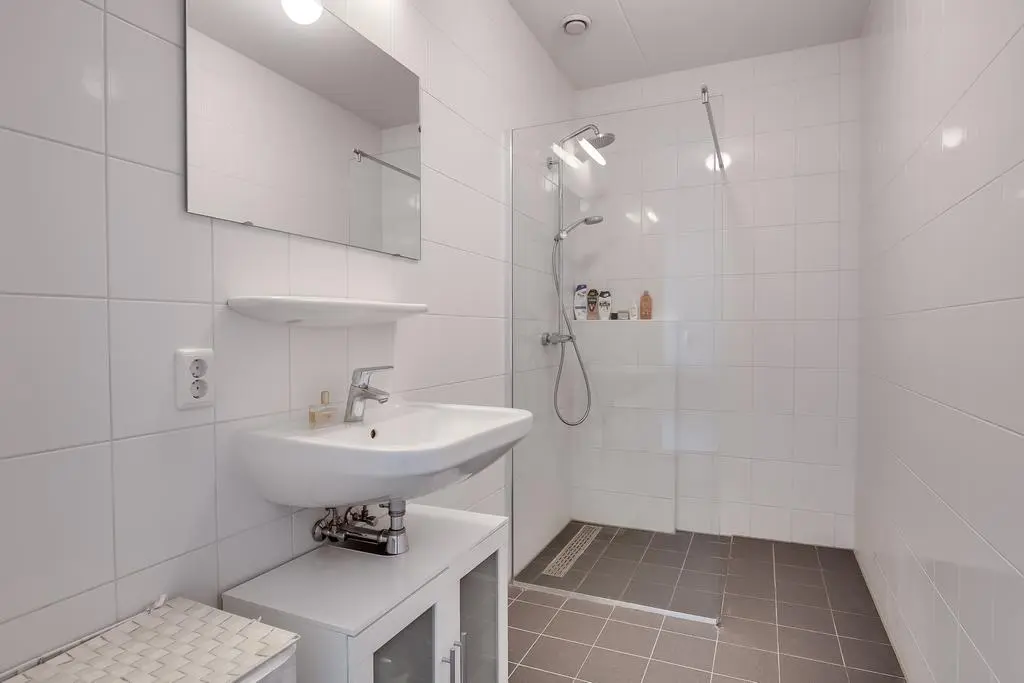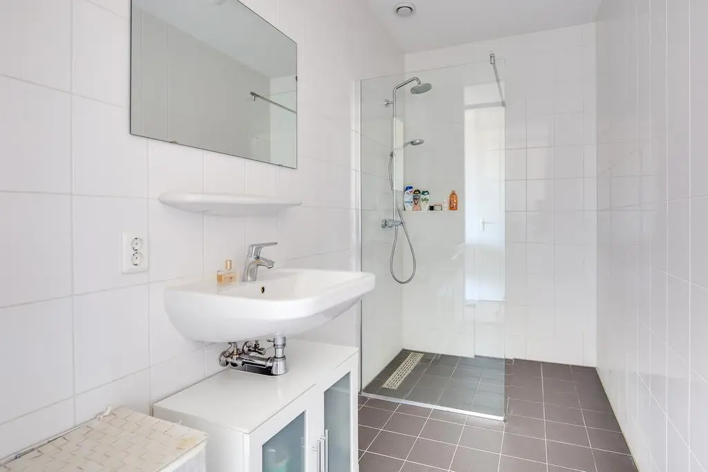 De geheel betegelde badkamer is modern afgewerkt en beschikt over vloerverwarming, een inloopdouche met thermostaatkraan en een wastafel met meubel.