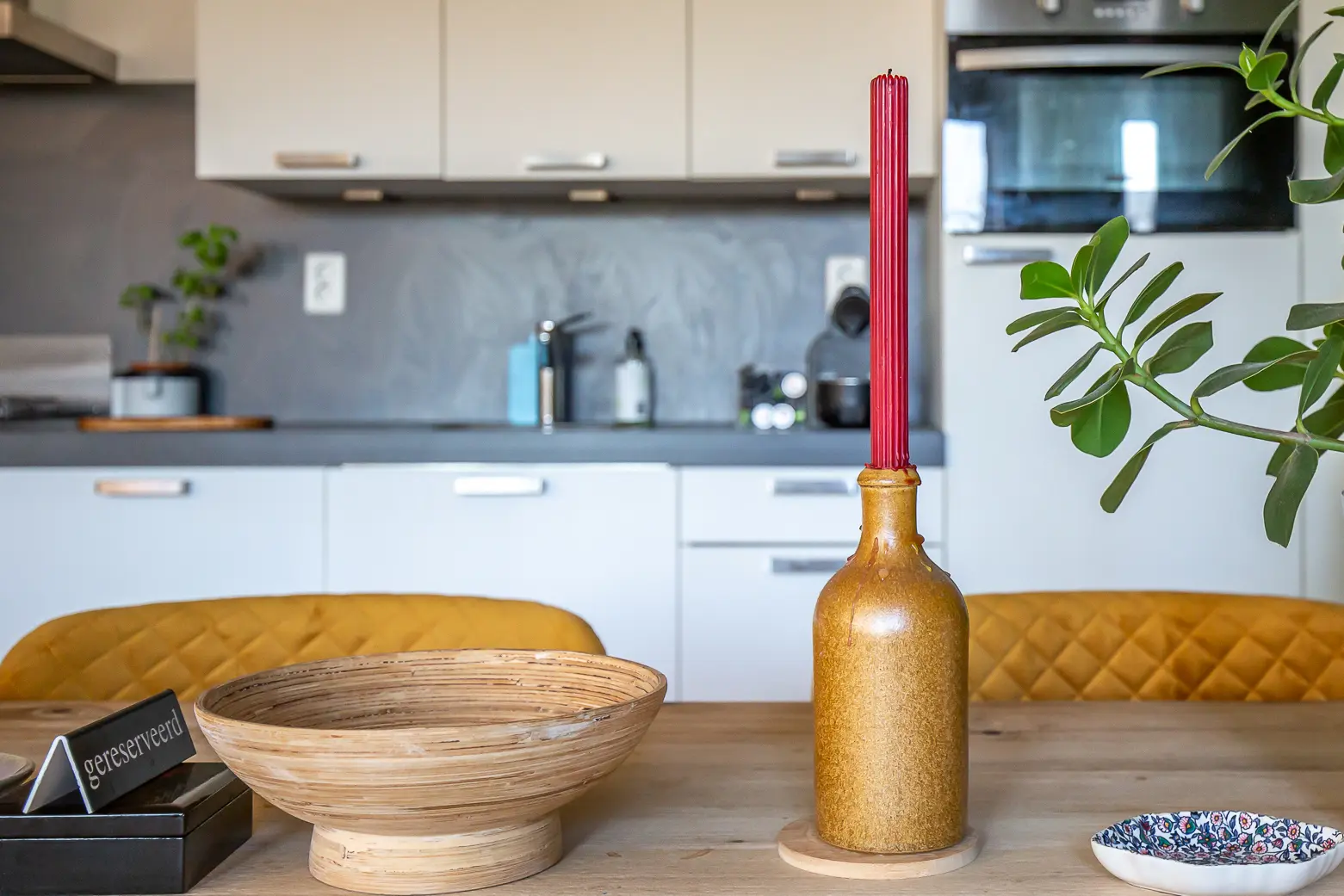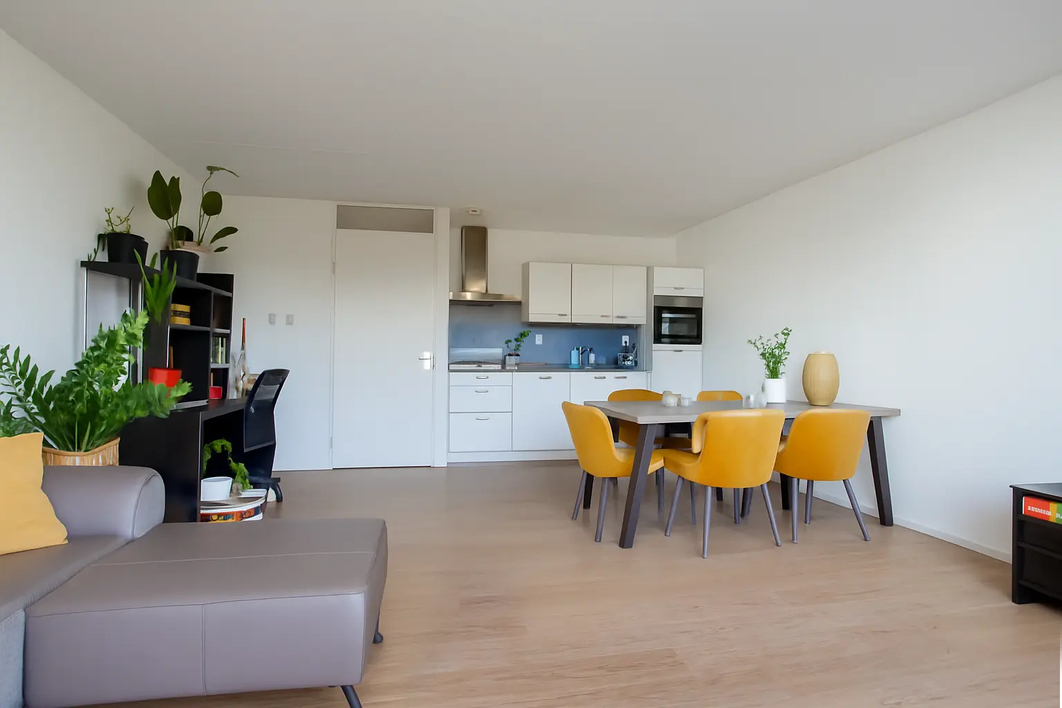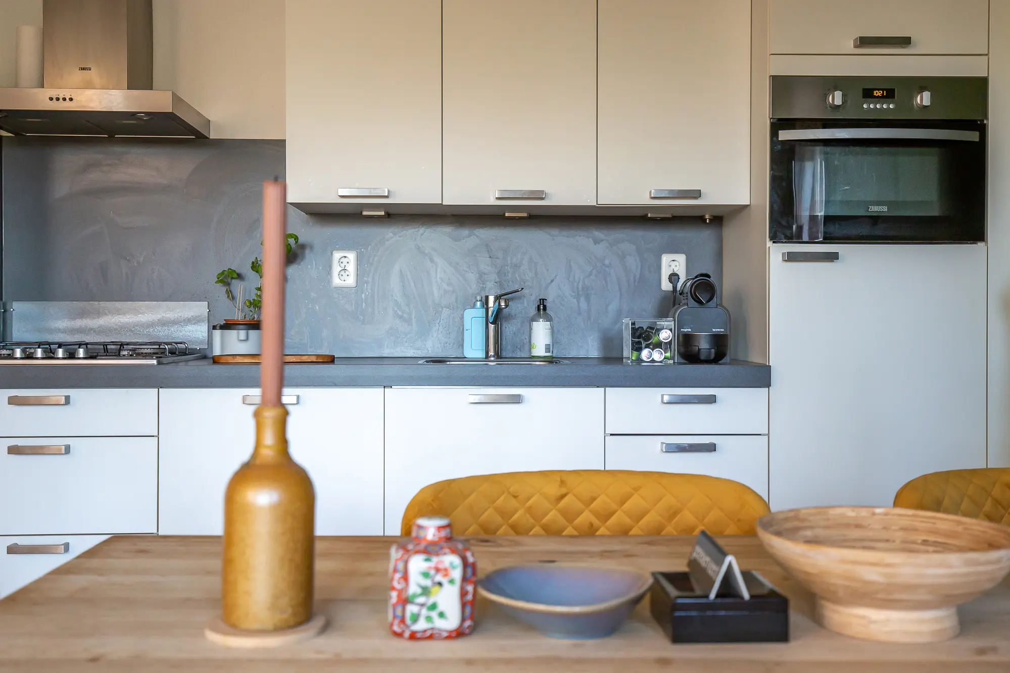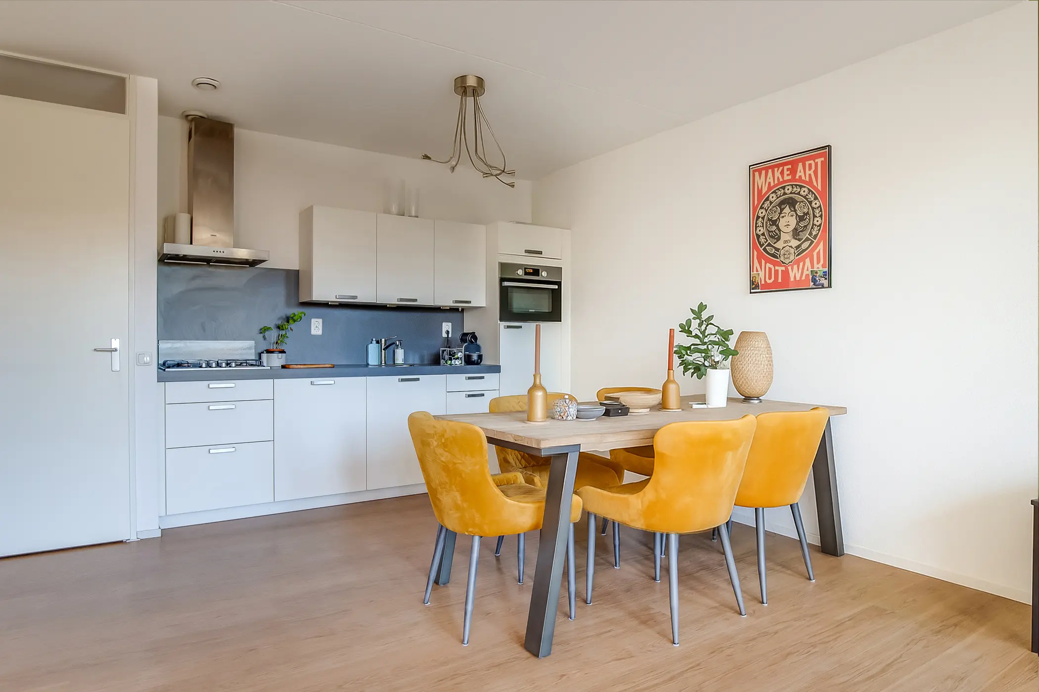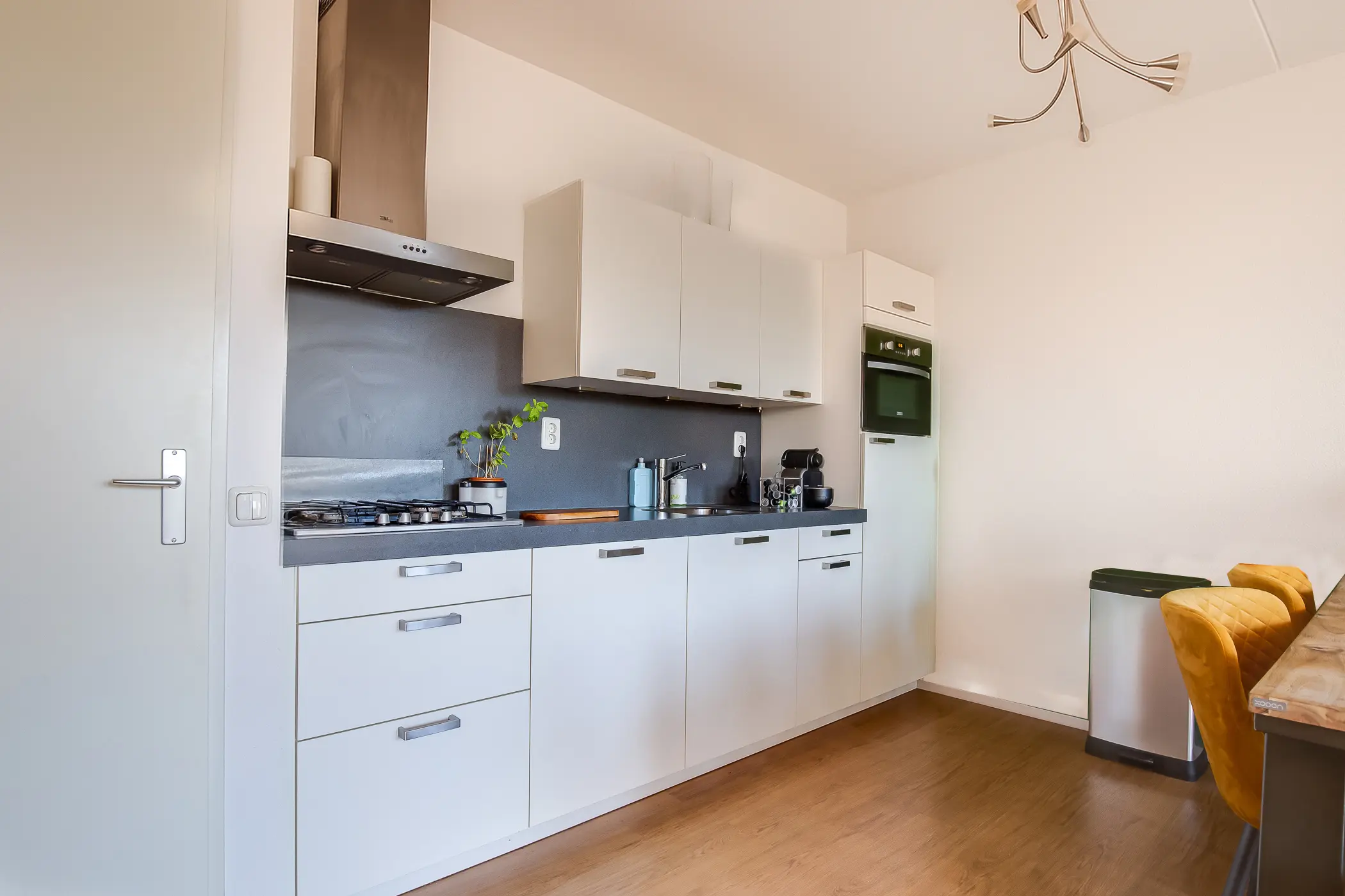 De open keuken is modern en voorzien van diverse inbouwapparatuur, zoals een koelkast, vaatwasser, combi-oven, 4-pits gaskookplaat en afzuigschouw. De woonkamer is afgewerkt met een PVC vloer met vloerverwarming.