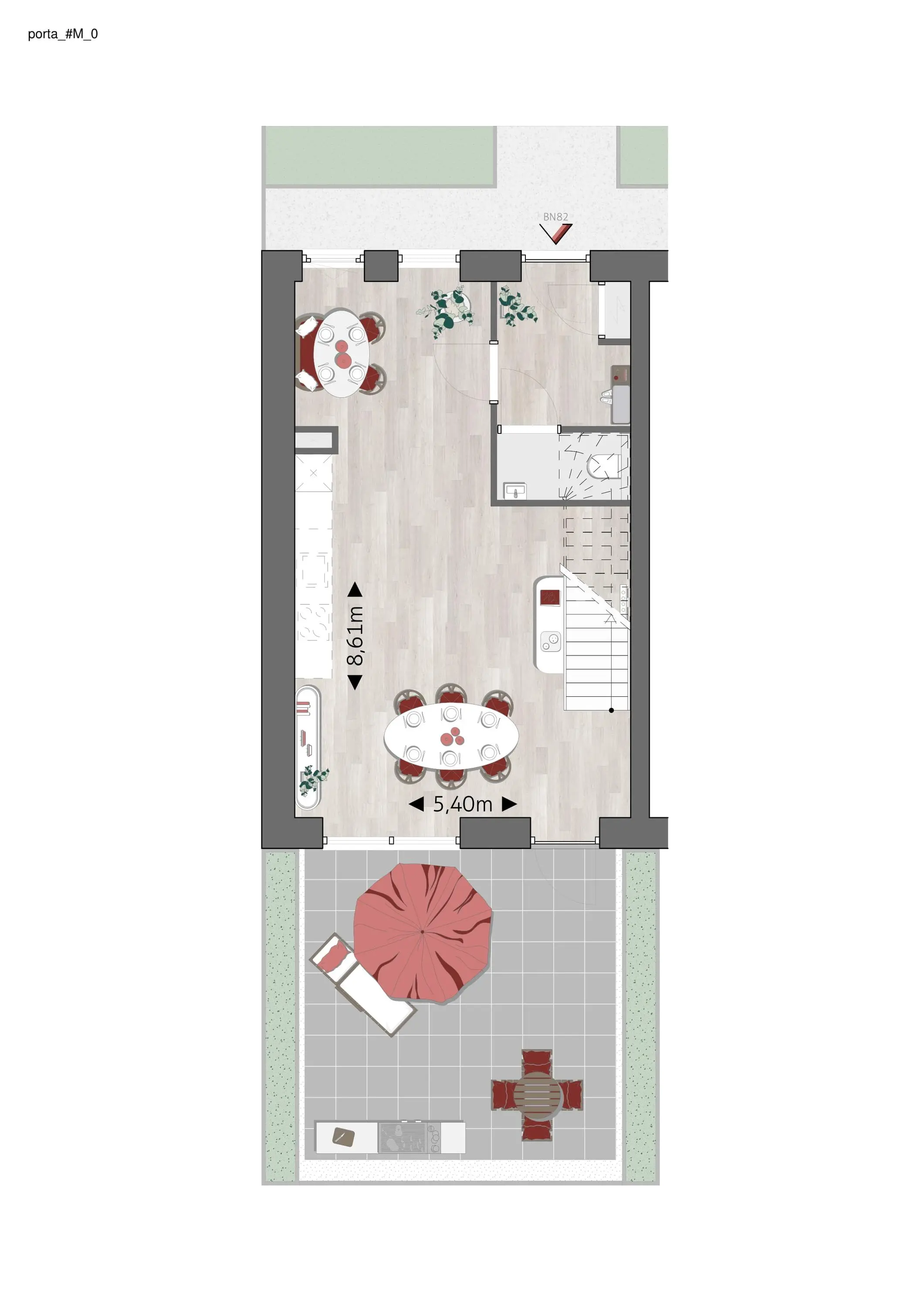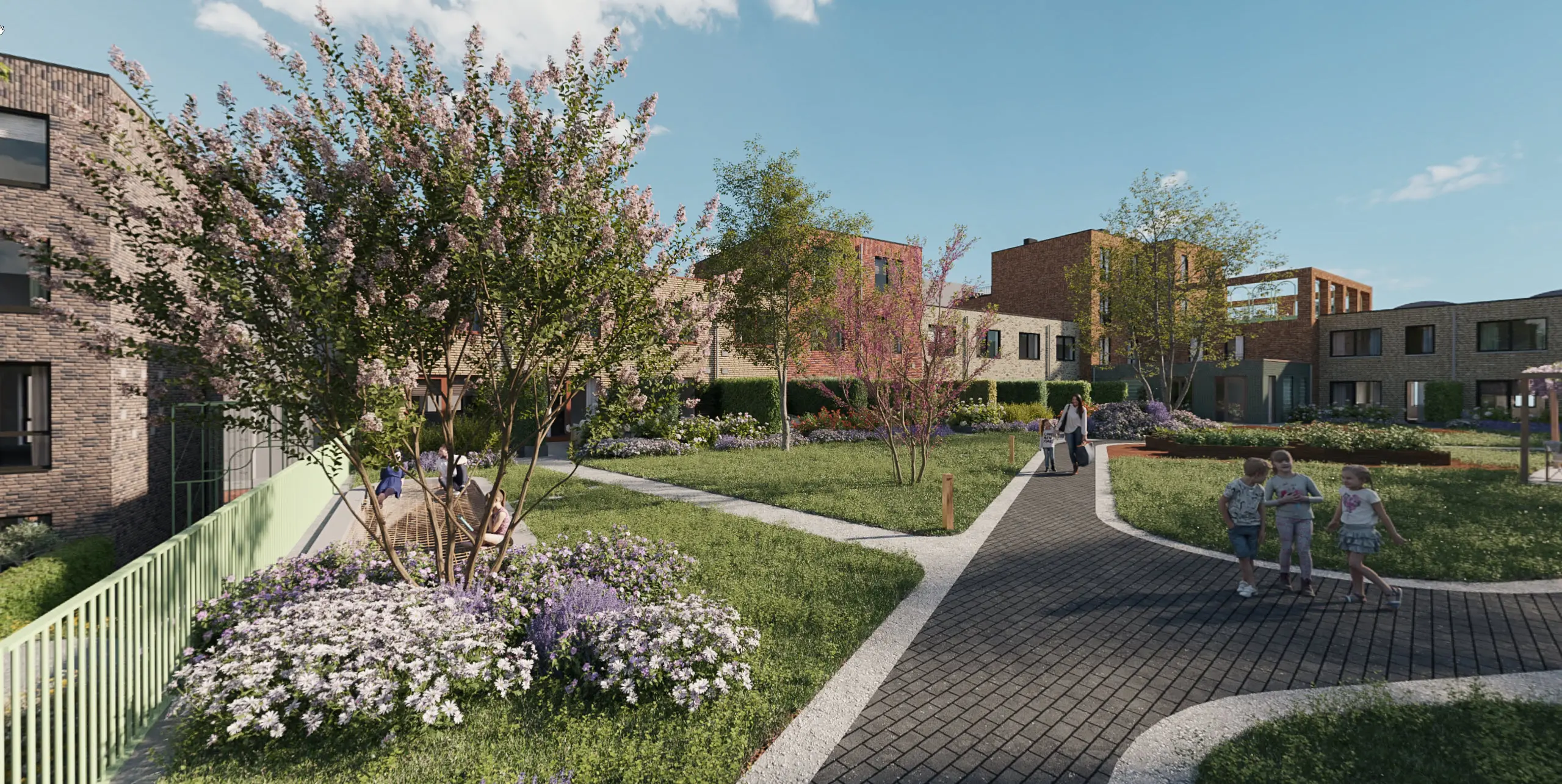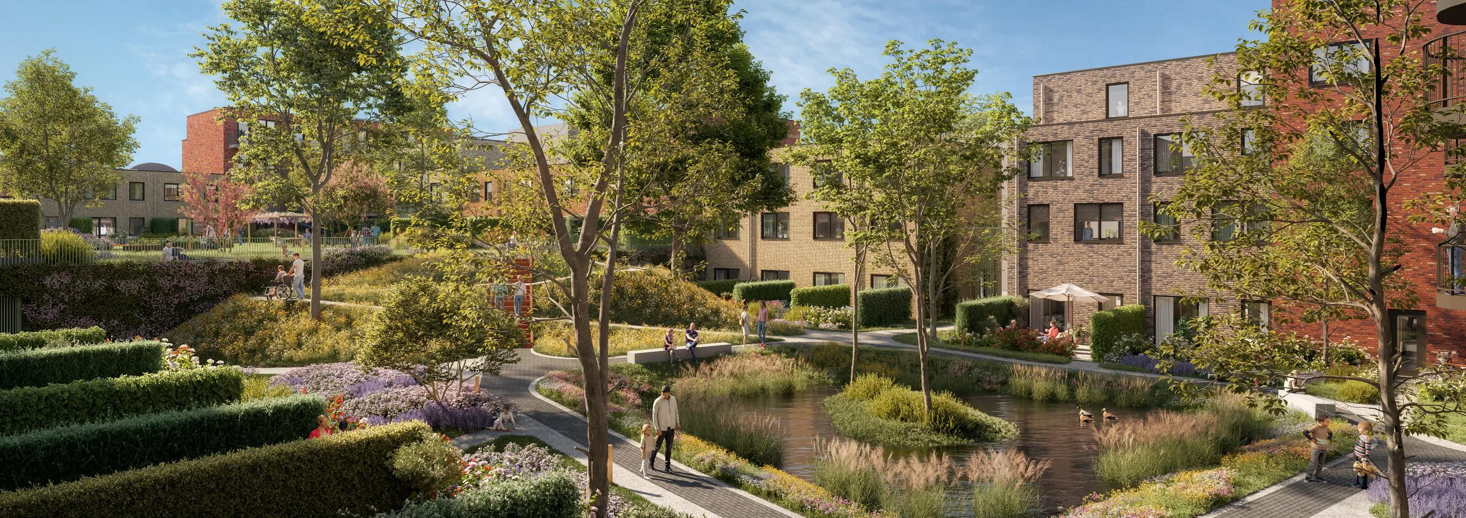 De binnentuin van PORTA biedt een balans tussen privacy en samenzijn. Bewoners hebben een privétuin of balkon, terwijl gezamenlijke plekken zoals het terras, de speelweide en de moestuin ontmoeting stimuleren. Rustige zitjes bij de waterpartij bieden ruimte om te ontspannen, terwijl het grasveld gebruikt kan worden voor buurtactiviteiten zoals een barbecue of buitenbioscoop.