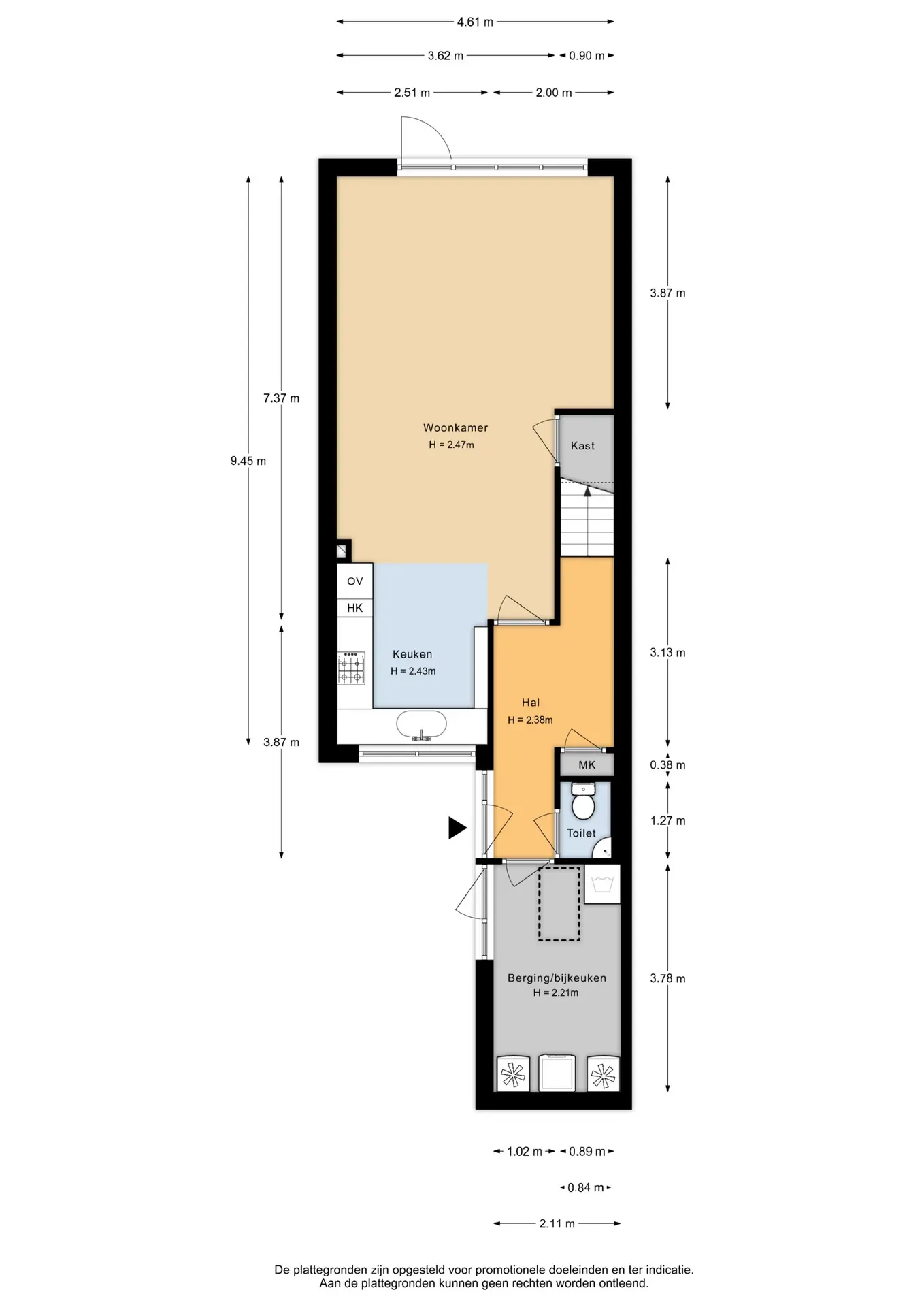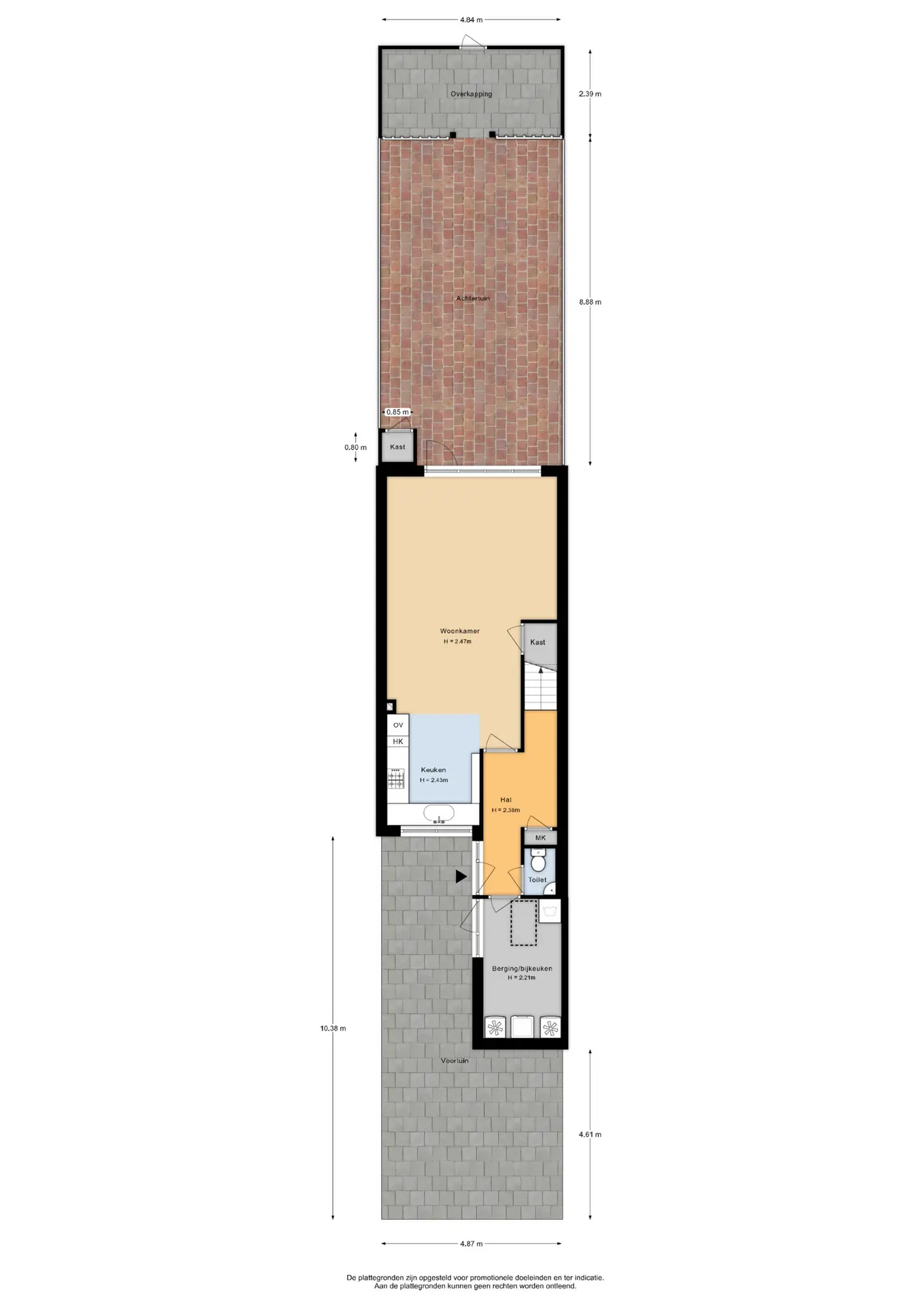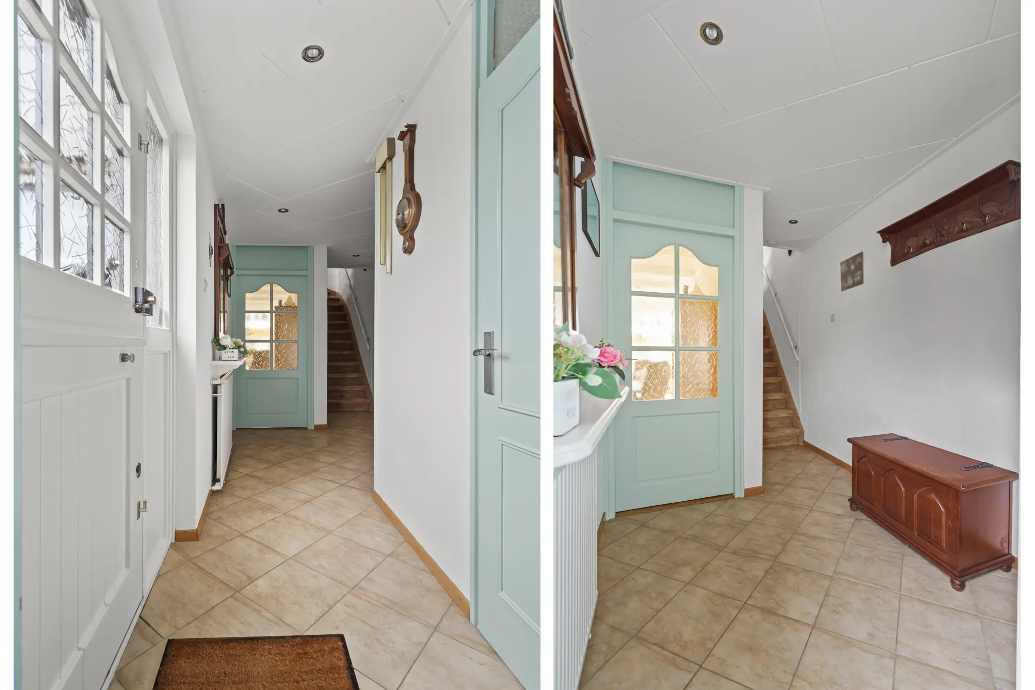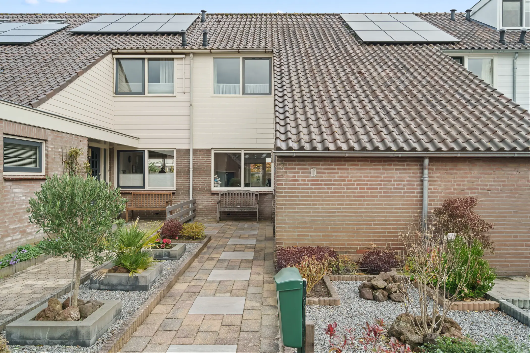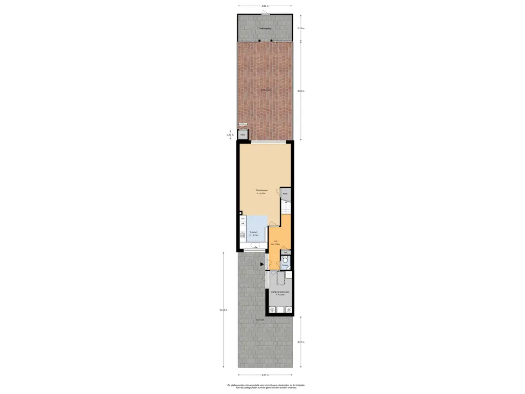 Aan de voorzijde ligt een verzorgde voortuin die direct een warme en uitnodigende indruk maakt. Hier bereik je zowel de bijkeuken/berging als de hoofdentree. Binnen stap je de lichte, royale hal binnen die toegang biedt tot de sfeervolle woonkamer en de praktische bijkeuken/berging. Tevens vind je hier het toilet, de trap naar de eerste verdieping en de meterkast.