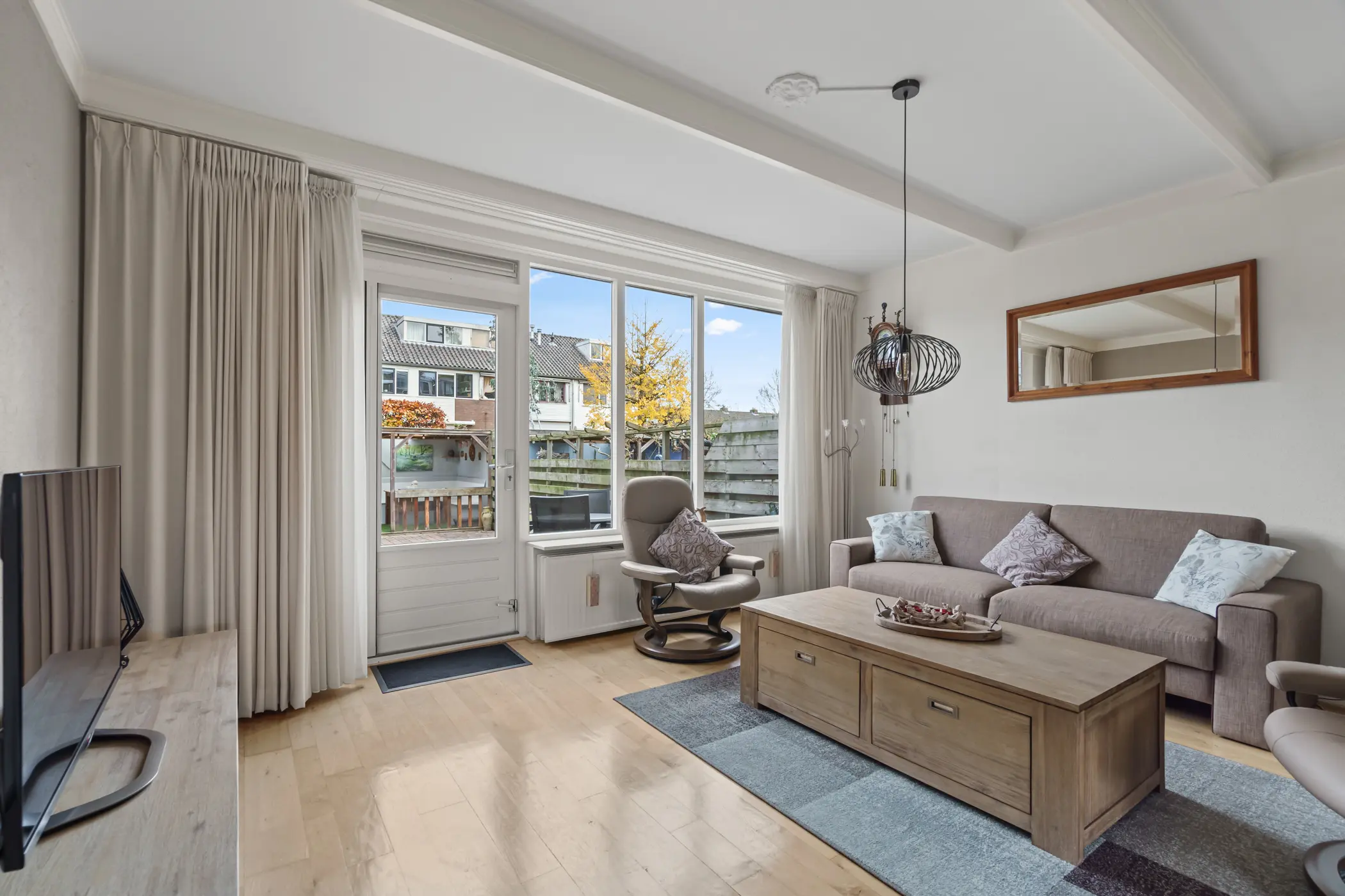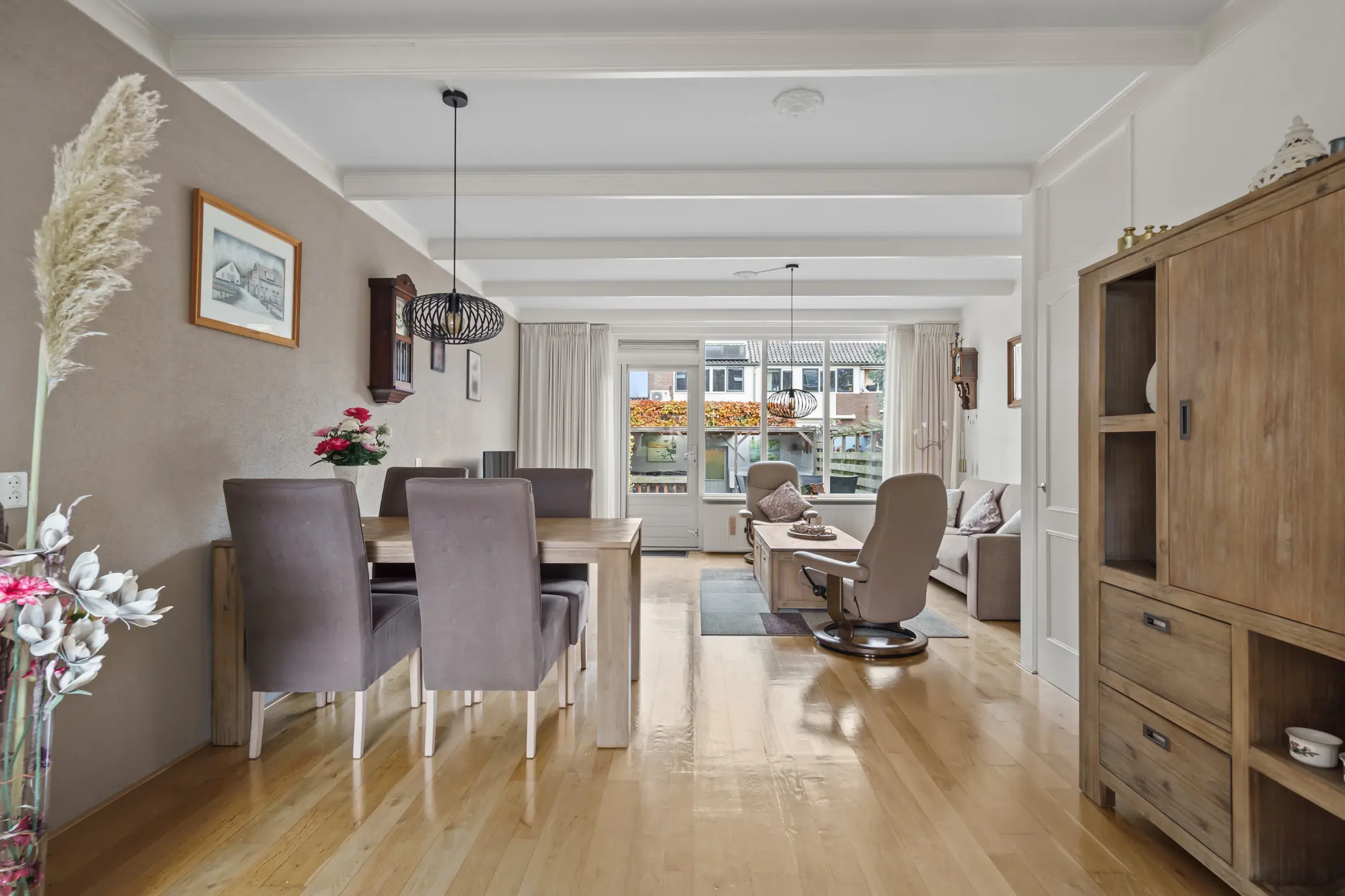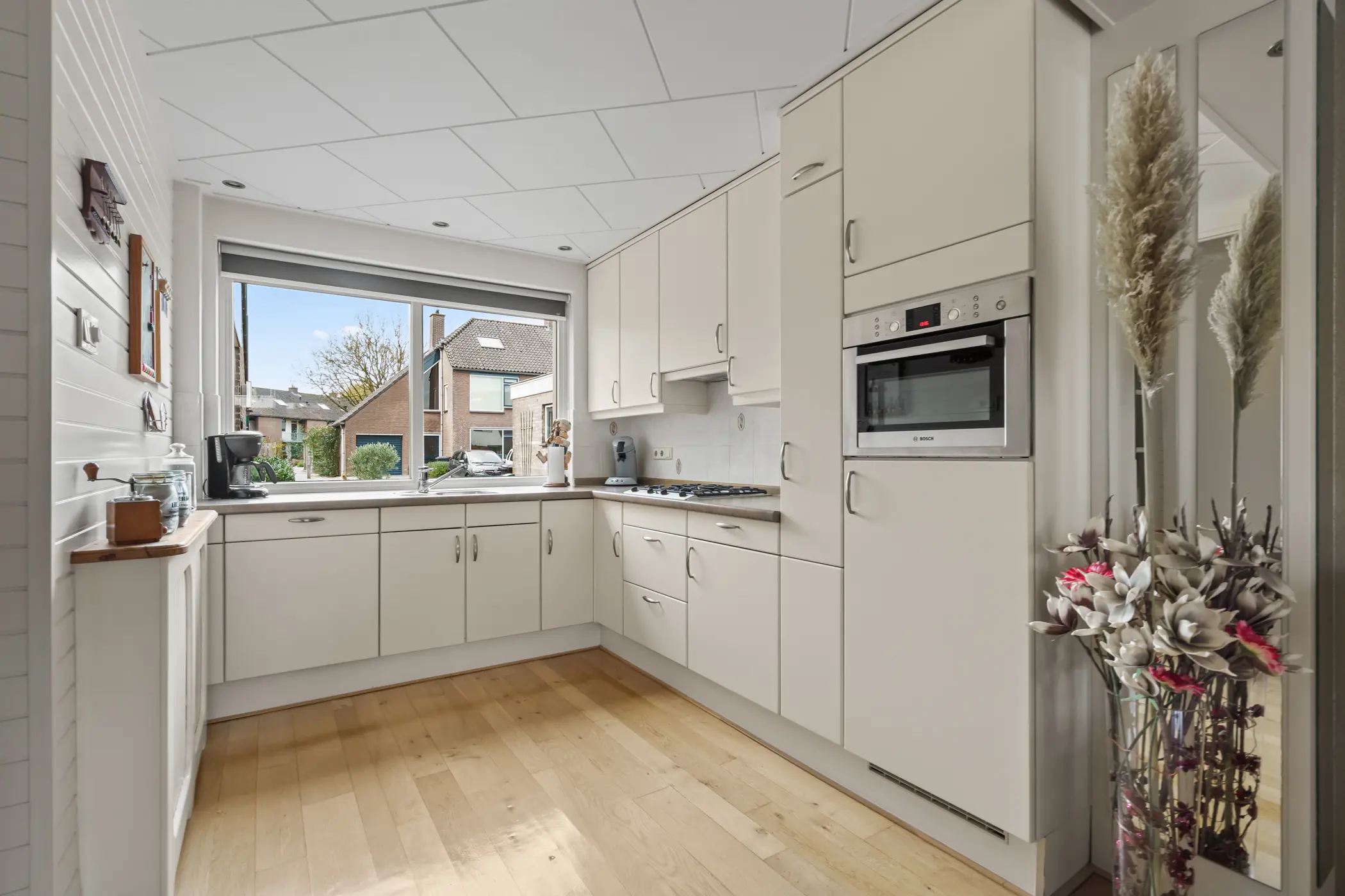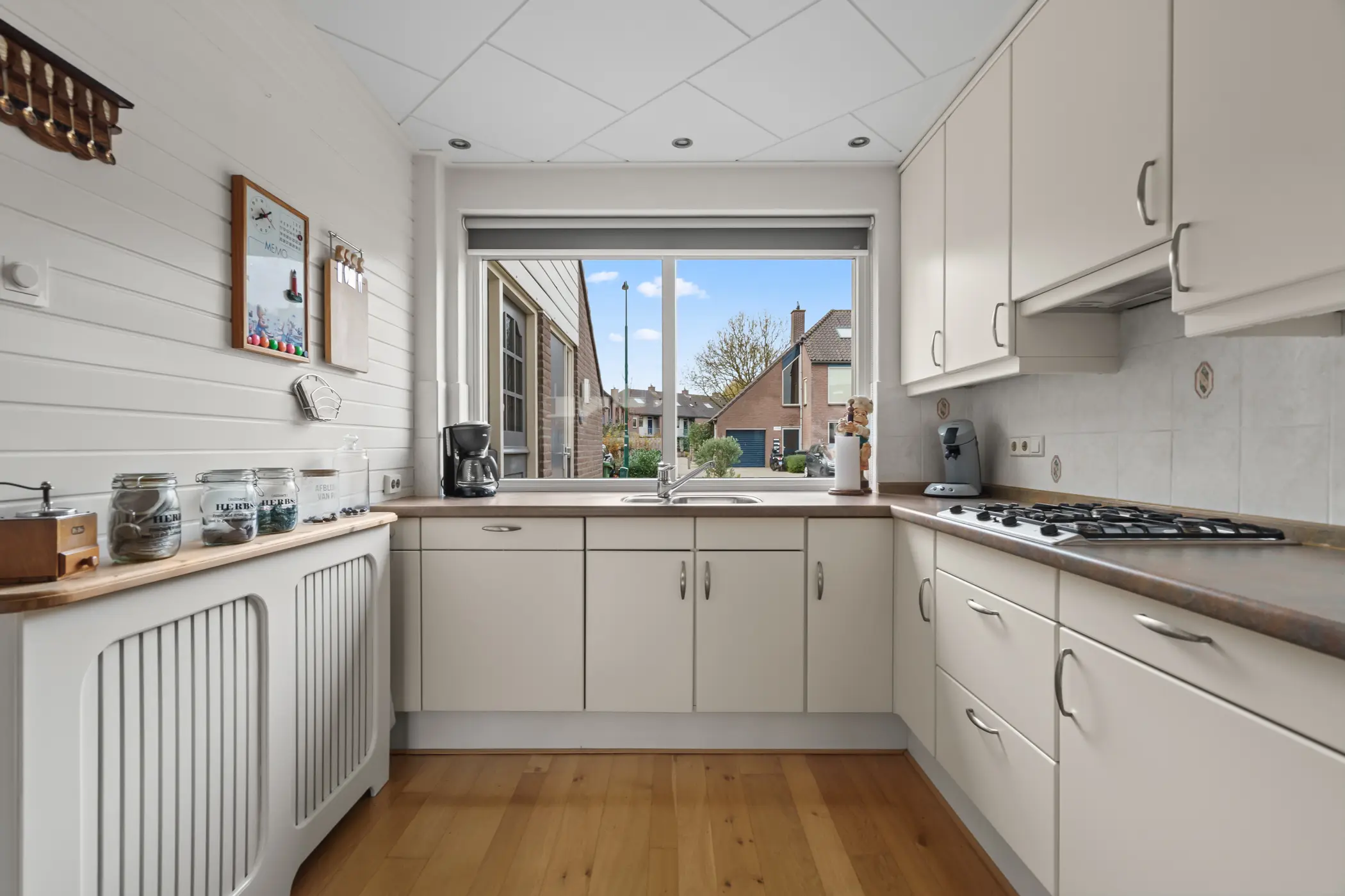 De L-vormige keuken aan de voorzijde is voorzien van een 4-pits gaskookplaat, combi-oven, vaatwasser, koelkast en afzuigsysteem. De woonkamer is voorzien van een massief eikenhouten parketvloer, welke zorgt voor een warme, huiselijke sfeer. De ruime woonkamer is gezellig en praktisch ingericht, met een ruime trapkast voor extra opbergruimte. De deur naar de achtertuin leidt naar een heerlijke ruime achtertuin waar plek is om in alle rust van het buitenleven te genieten.