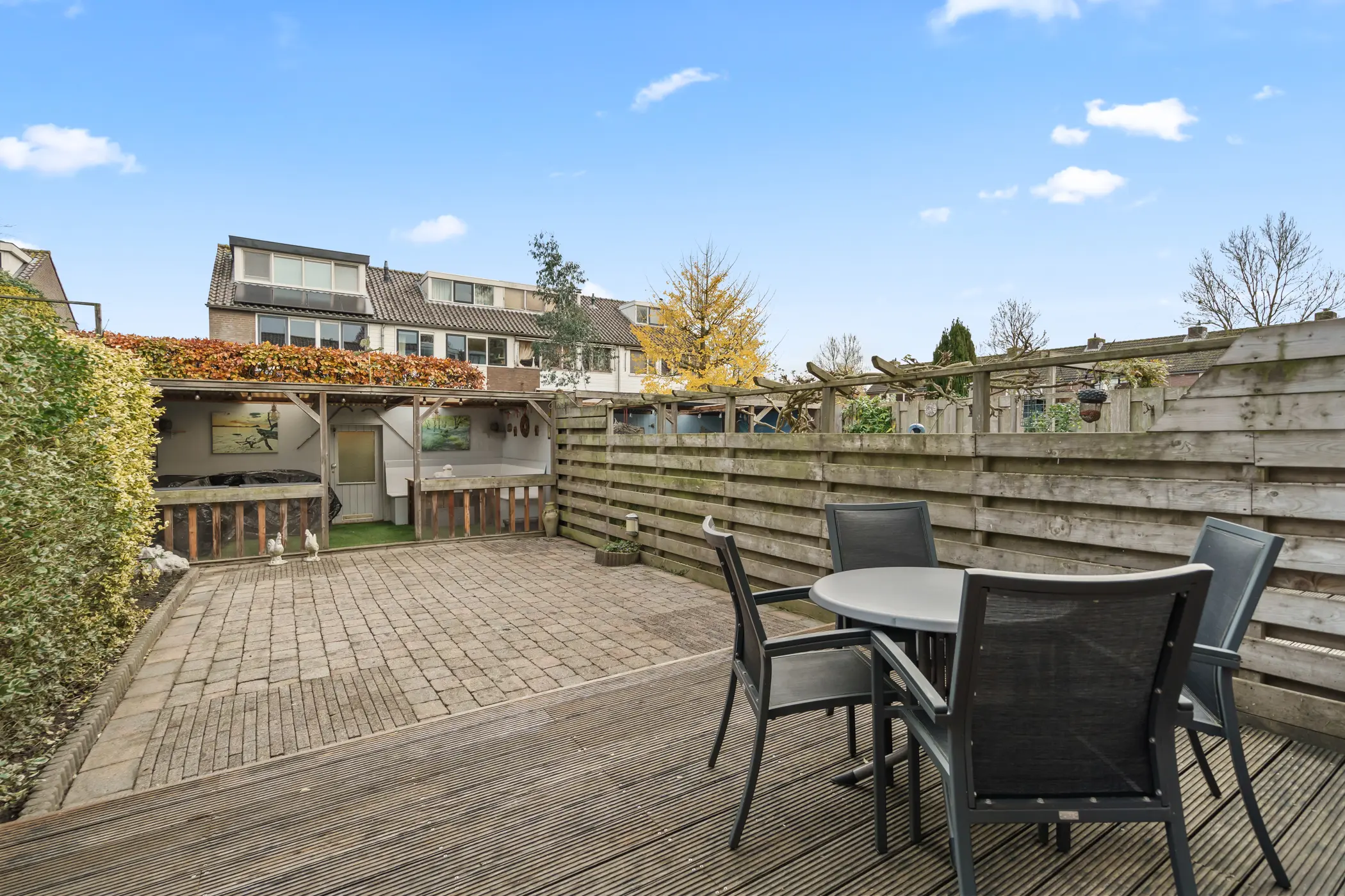 De achtertuin is op het noordoosten gelegen en is goed onderhouden. Met een diepte van circa 11 meter is het een royale tuin die talloze mogelijkheden biedt voor speelruimte, loungesets of een heerlijke tuintafel. Achterin de tuin bevindt zich een grote veranda waar je gezellig kunt zitten met familie en vrienden, of kunt ontspannen met een kop koffie. Daarnaast is er een praktische achterom aanwezig en een handige kast voor tuingereedschap of tuinkussens.