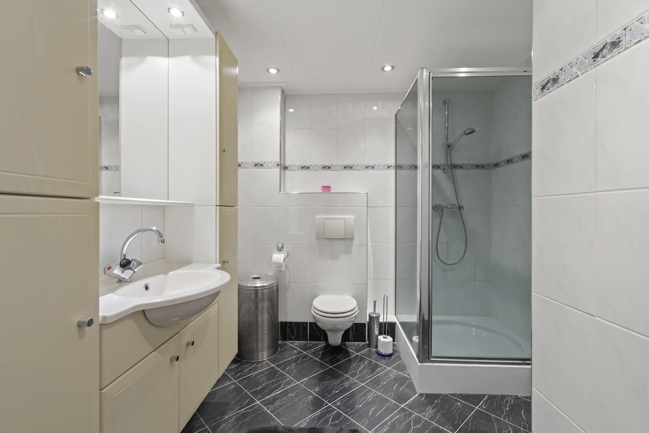 • Geheel betegelde badkamer met douchecabine, wastafelmeubel en wandcloset