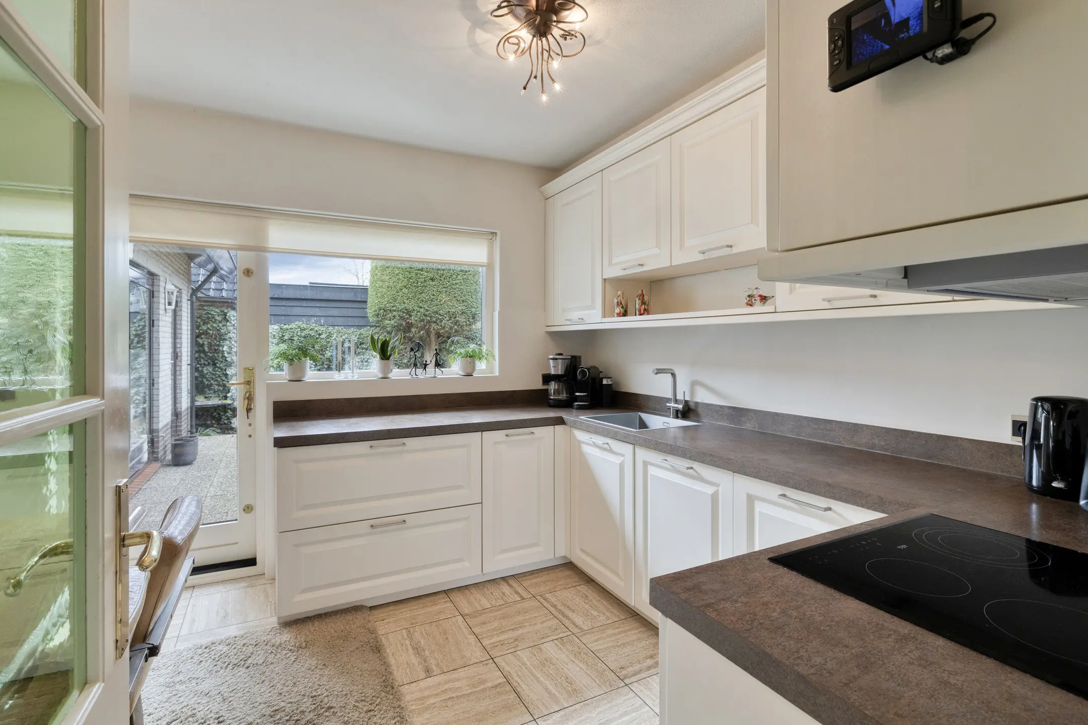 De keuken is voorzien van een keramische kookplaat, vaatwasser en oven. Vanuit de keuken heeft u toegang tot de tuin en tot een ruime en lichte slaapkamer op de begane grond. Deze kamer beschikt over een vaste kast en een loopdeur naar de tuin.