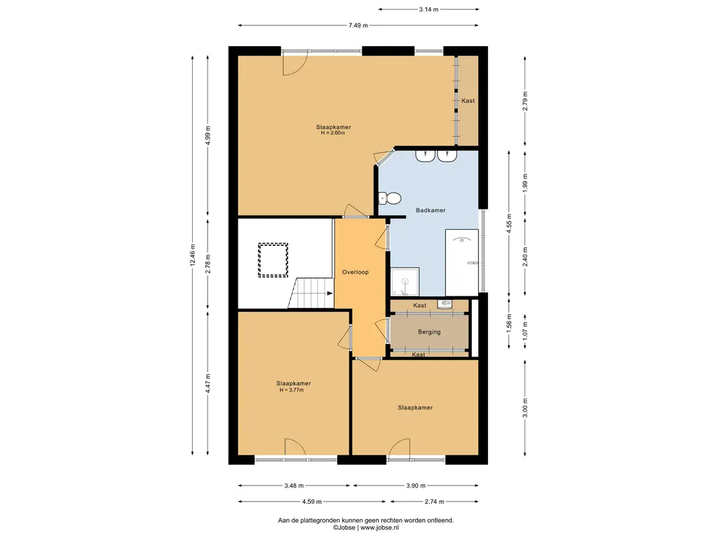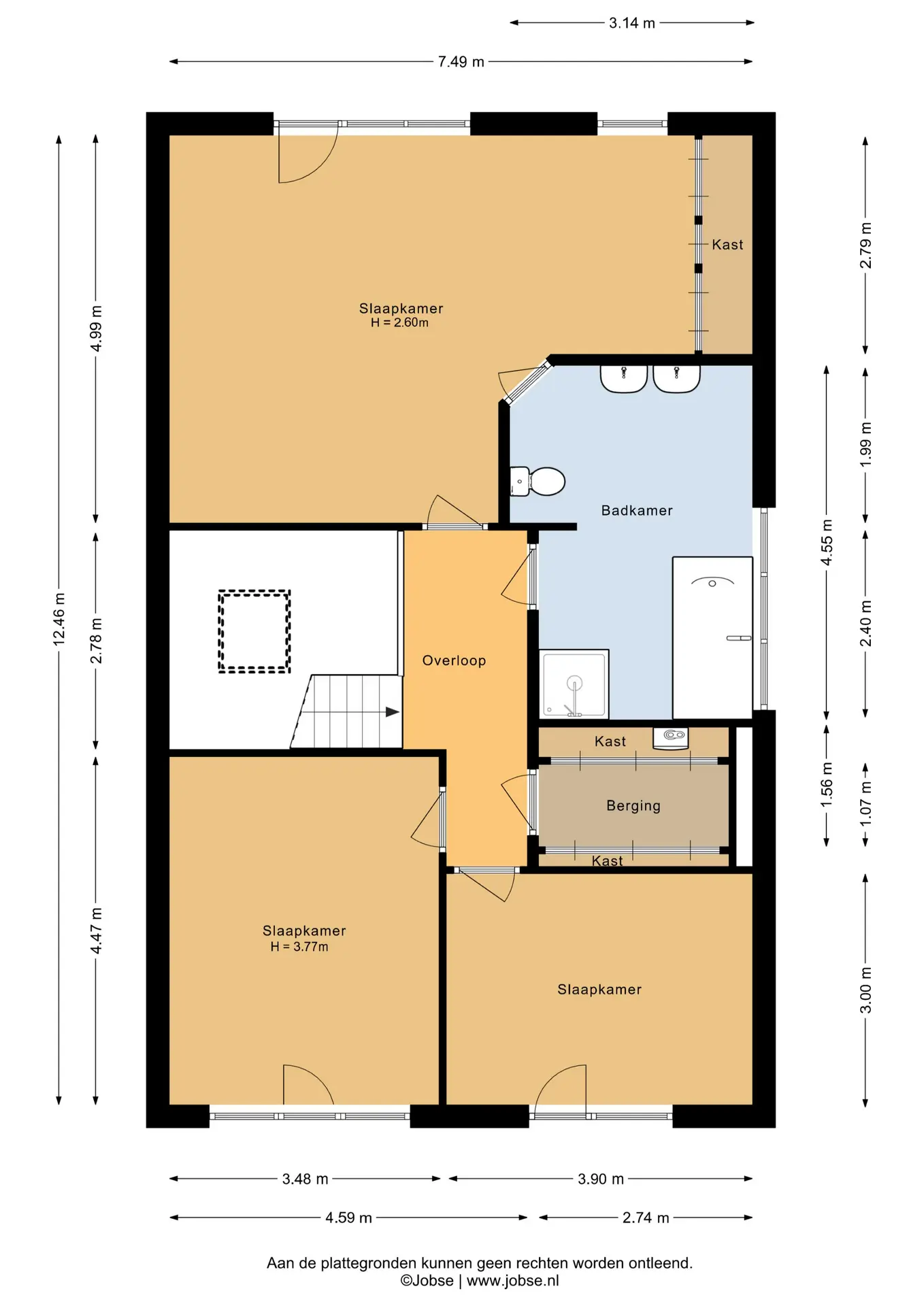 De overloop geeft toegang tot drie slaapkamers, de badkamer en een berging met vaste kasten en de opstelplaats van de cv-ketel. De slaapkamer aan de achterzijde heeft direct toegang tot de ruime badkamer. Deze badkamer is voorzien van twee wastafels, een toilet, een ligbad en een douchecabine. De slaapkamers aan de voorzijde hebben beide toegang tot het balkon.