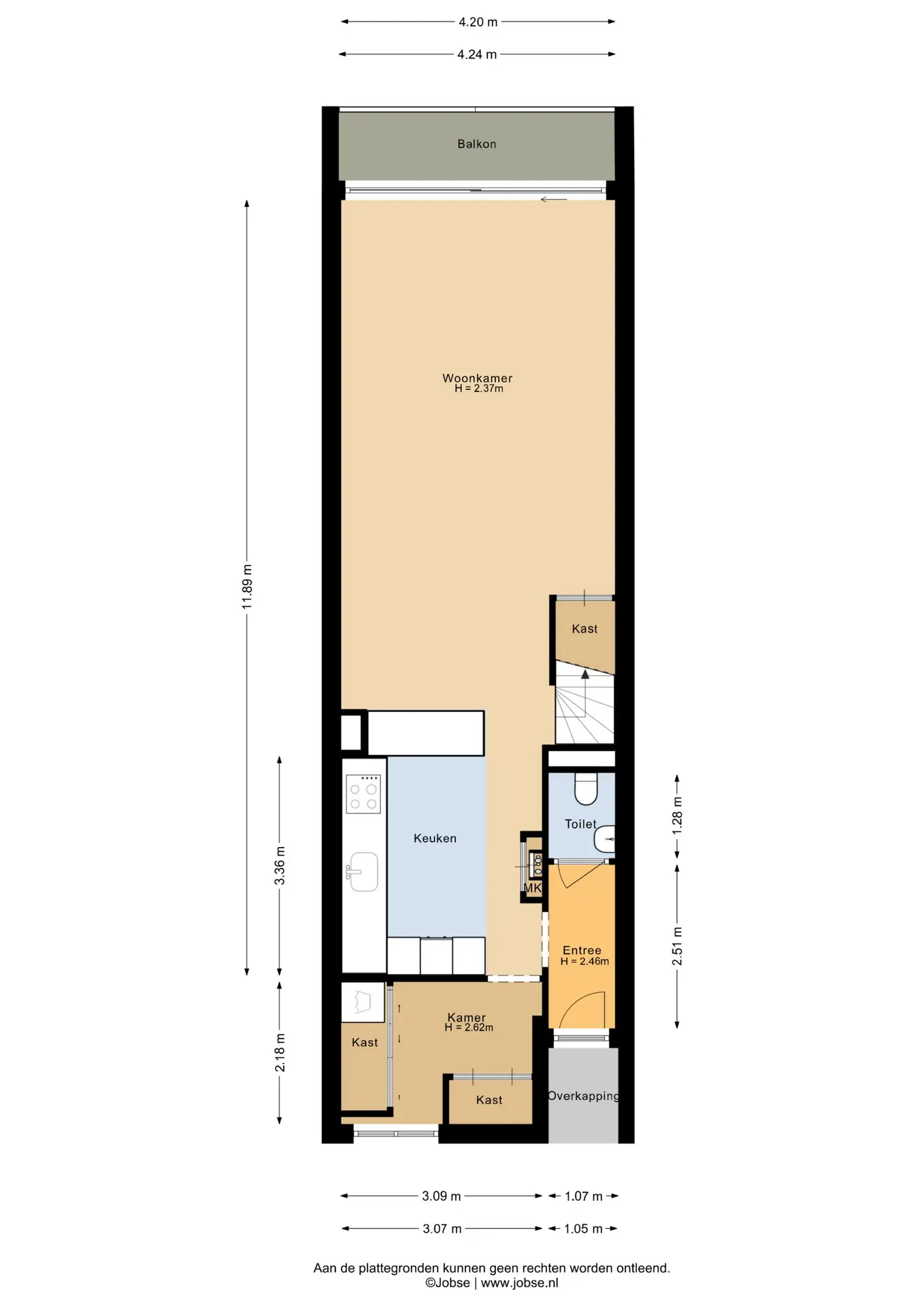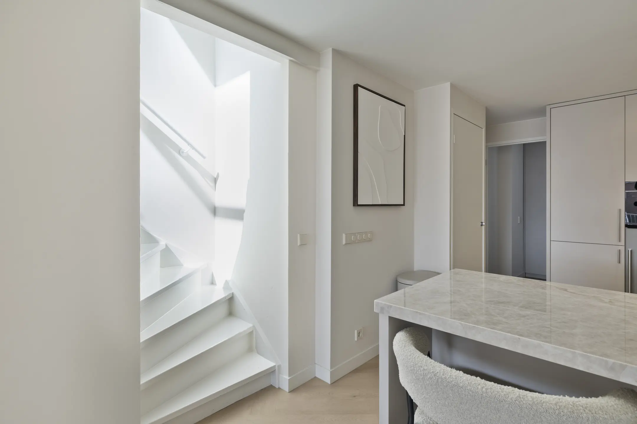 De lichte en sfeervolle woonkamer is aan de achterzijde gelegen en voorzien van een fraaie visgraatvloer. De woonkamer beschikt over airconditioning. Onder de trap bevindt zich een praktische trapkast. Via de schuifpui stapt u direct het balkon op aan de Rijnzijde, dat is voorzien van elektrische zonwering.
