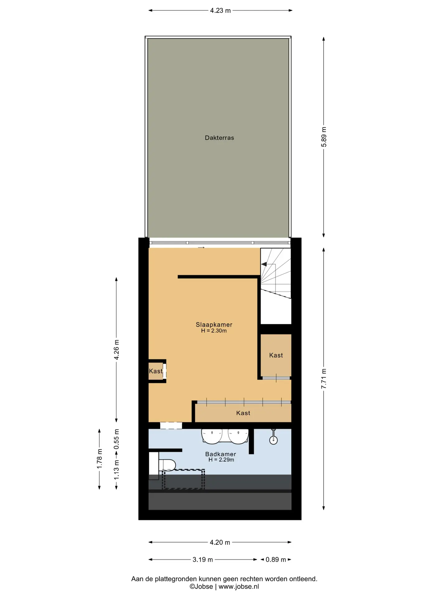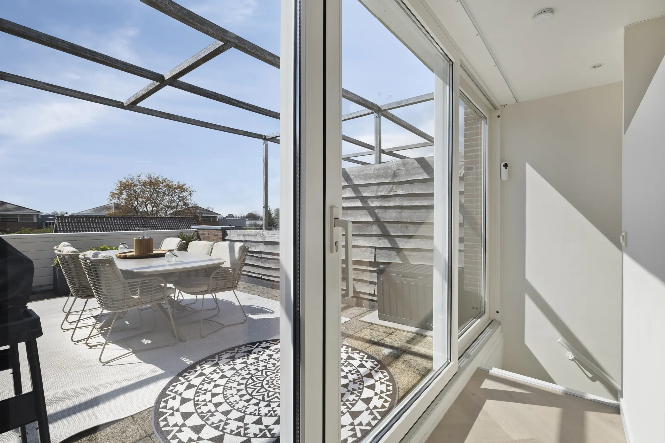 Via de trap bereikt u de slaapkamer, badkamer en het riante dakterras. Het royale dakterras op het zuiden is een heerlijke plek om te ontspannen en te genieten van volledige privacy en een vrij uitzicht over de Oude Rijn.