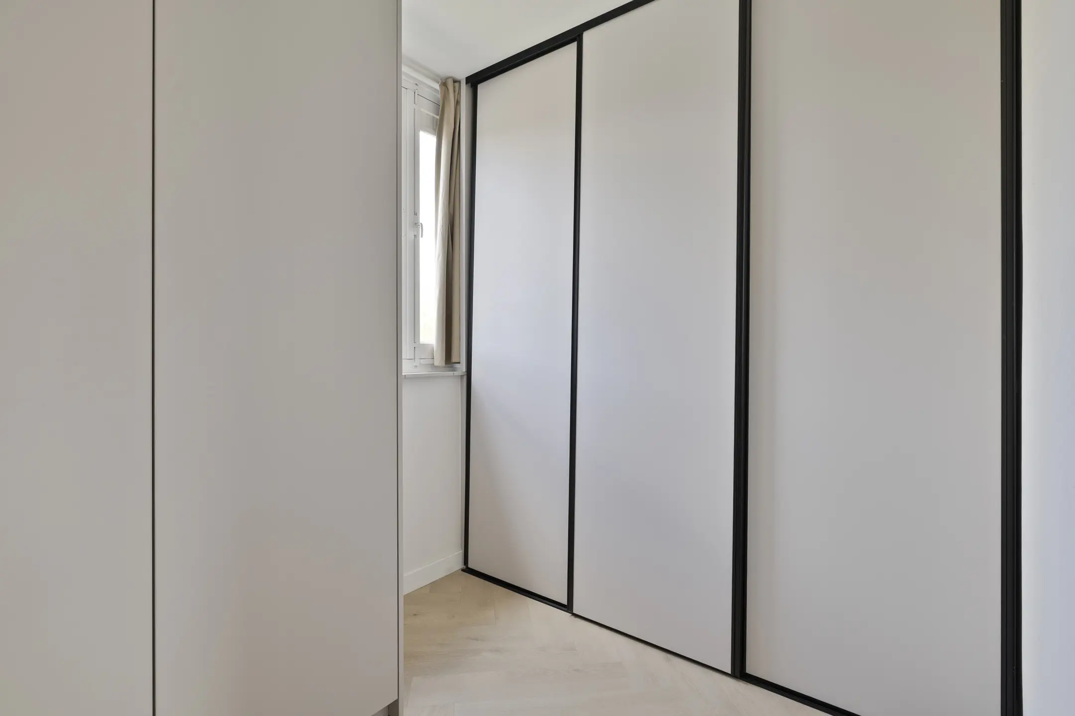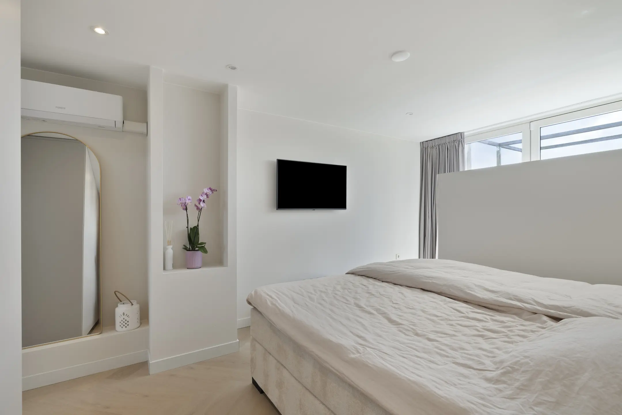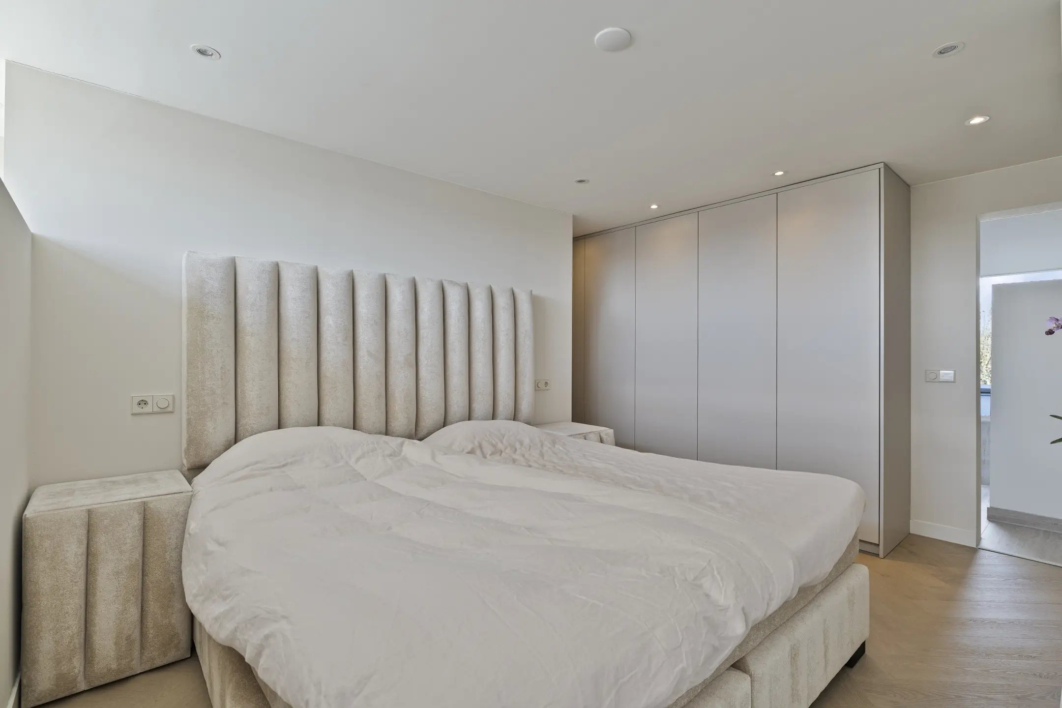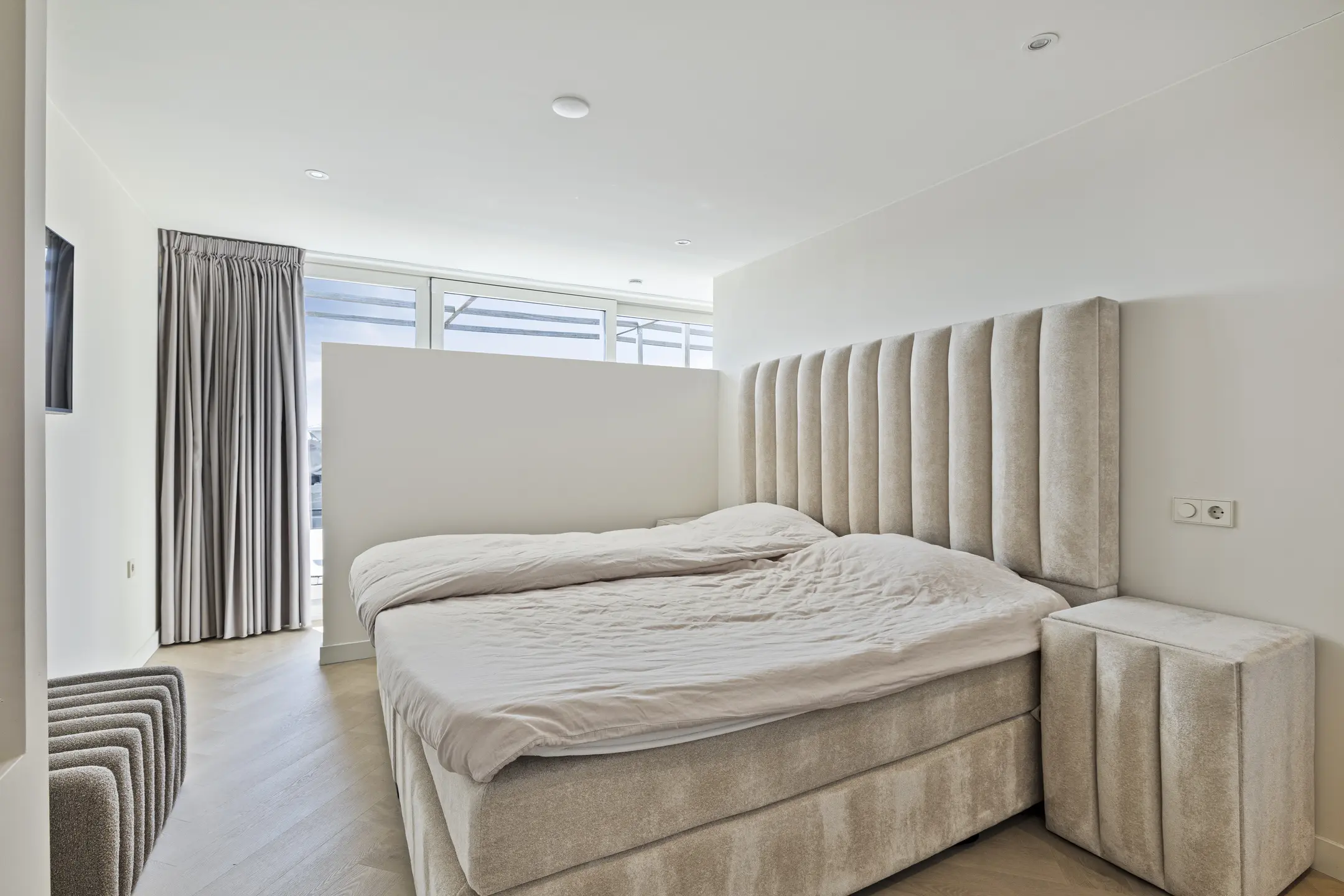 De slaapkamer is verzorgd afgewerkt met een pvc-vloer, gestucte wanden en een gestuct plafond en beschikt over een volledige wand met luxueuze inbouwkasten. Achter het bed bevindt zich bovendien een inloopkast. Daarnaast is de kamer voorzien van airconditioning, eveneens via smartphone te bedienen.