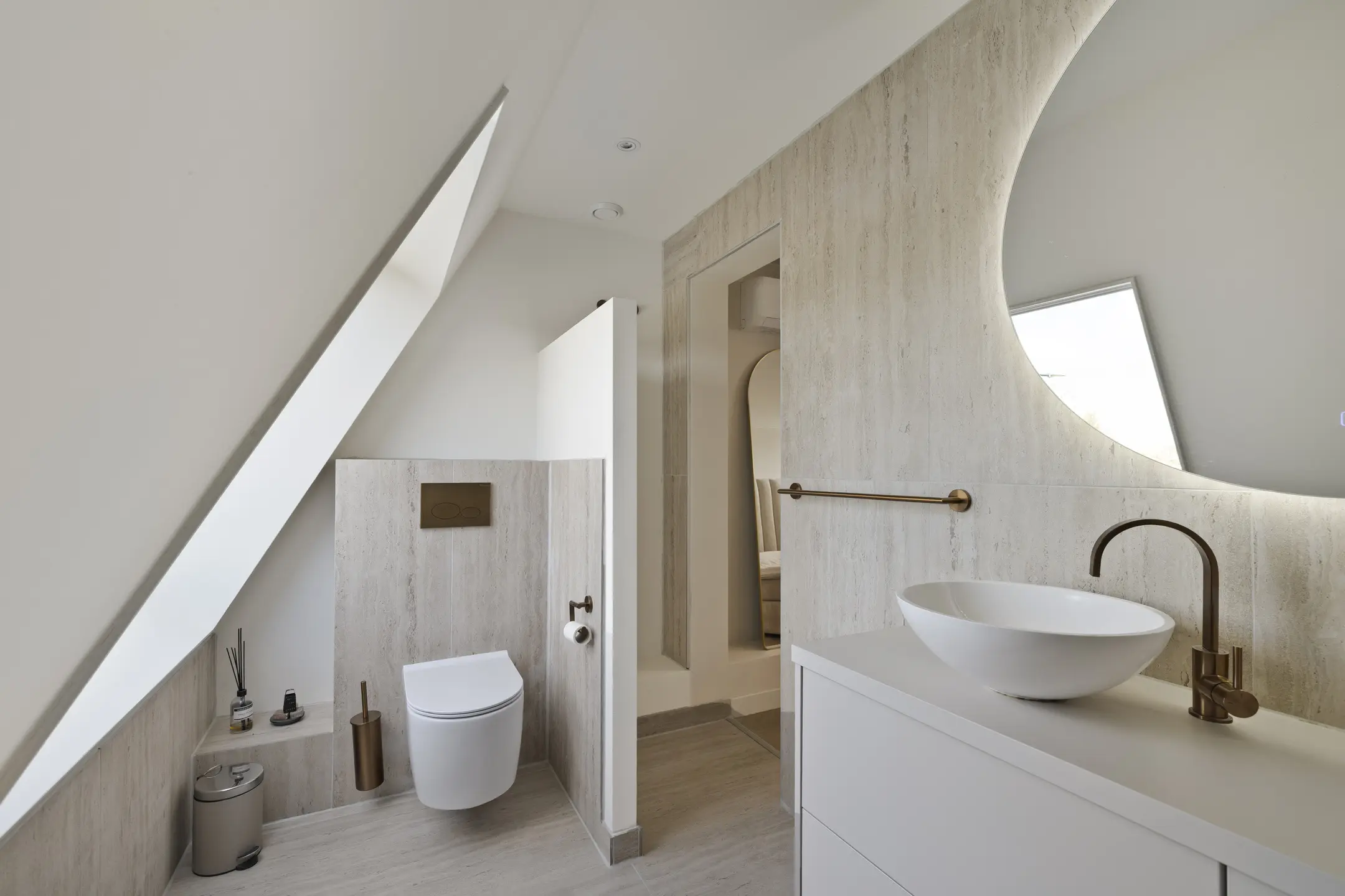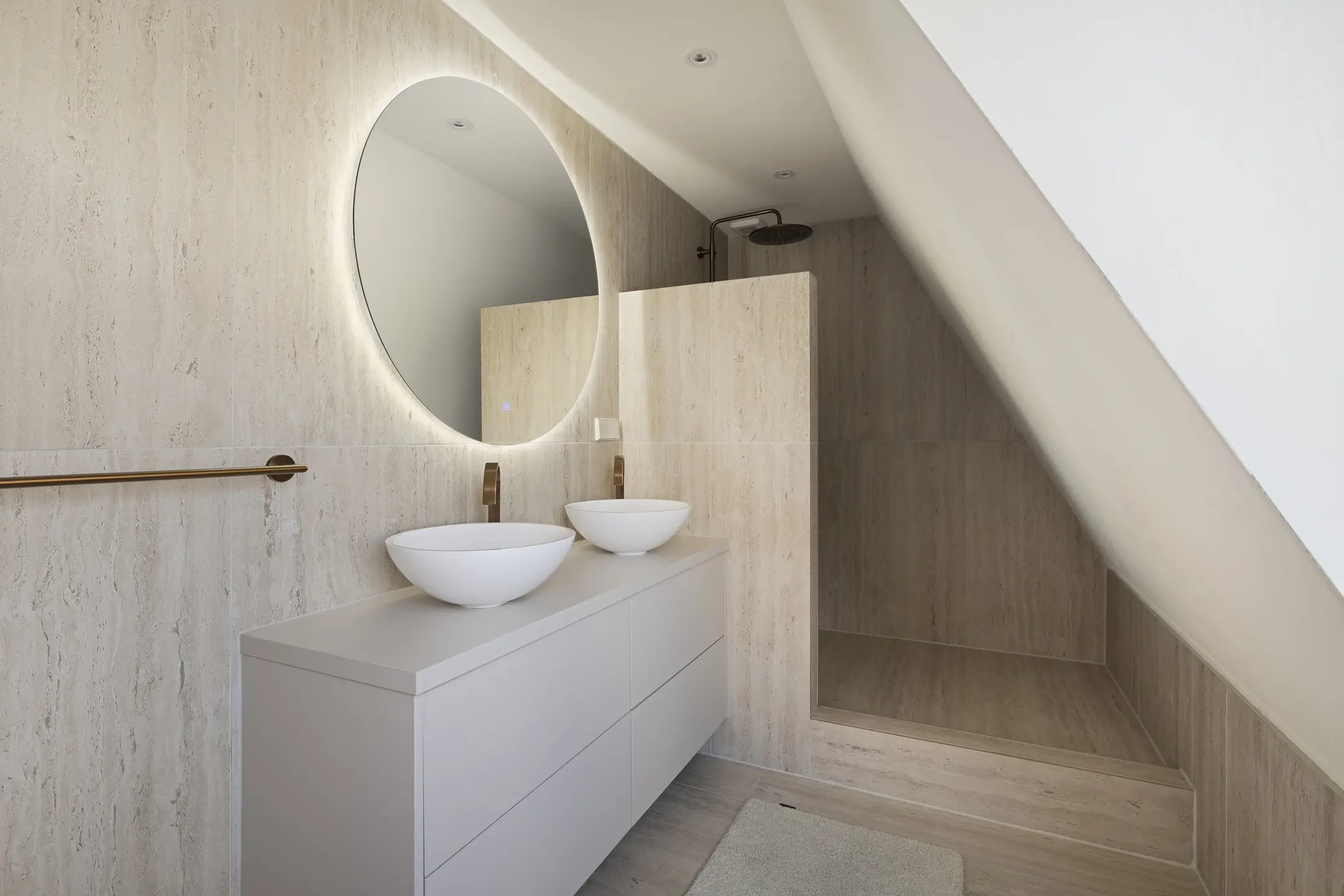 De moderne badkamer is eind 2023 vernieuwd en luxe afgewerkt met een dubbele wastafel met meubel, een inloopdouche met hand- en regendouche, een wandcloset en een verwarmde spiegel. Het dakraam zorgt voor aangenaam daglicht en een ruimtelijk gevoel.