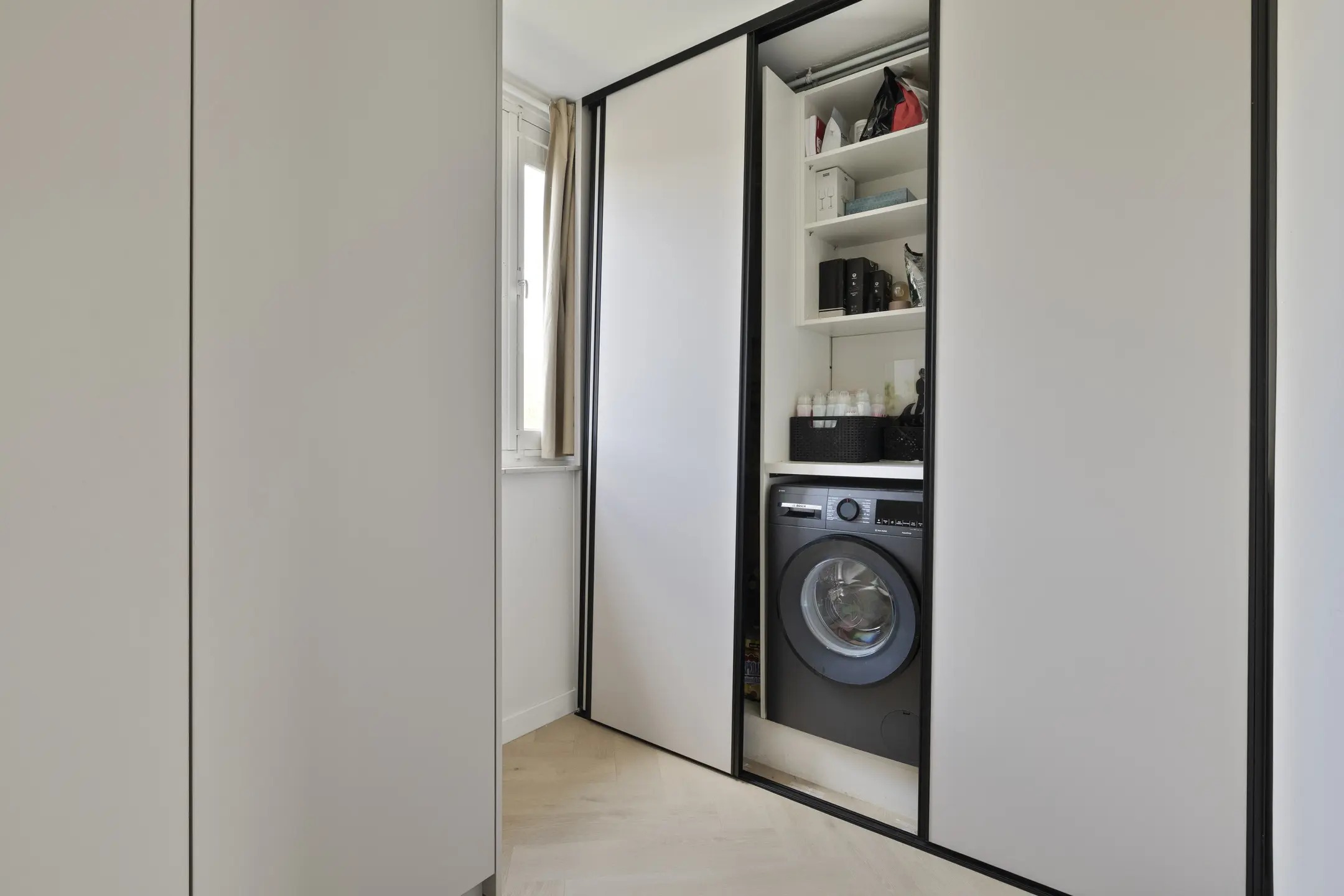 Entree met toegang tot de toiletruimte met sanibroyeurtoilet en fontein. Hier bevindt zich ook de eerste slaapkamer, waar tevens aansluitingen aanwezig zijn voor een wasmachine en droger. Deze kamer beschikt verder over mooie inbouwkasten, die in het hele huis in dezelfde kleur zijn uitgevoerd.