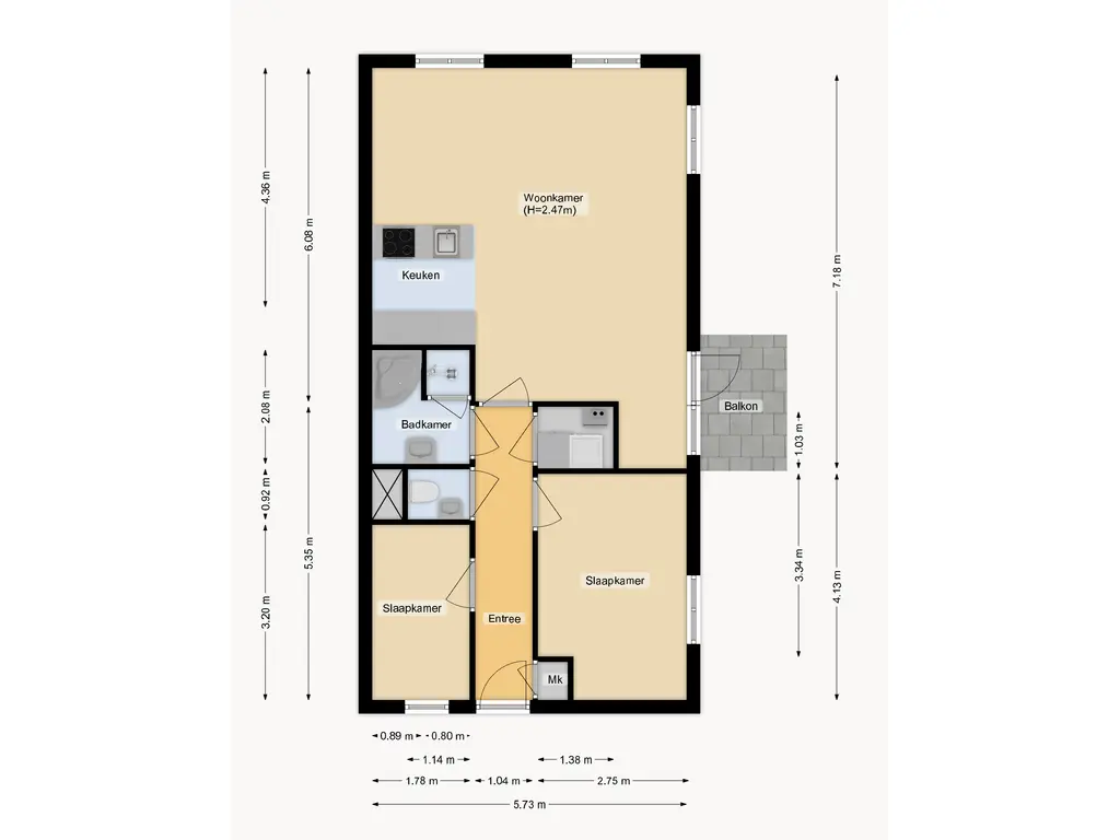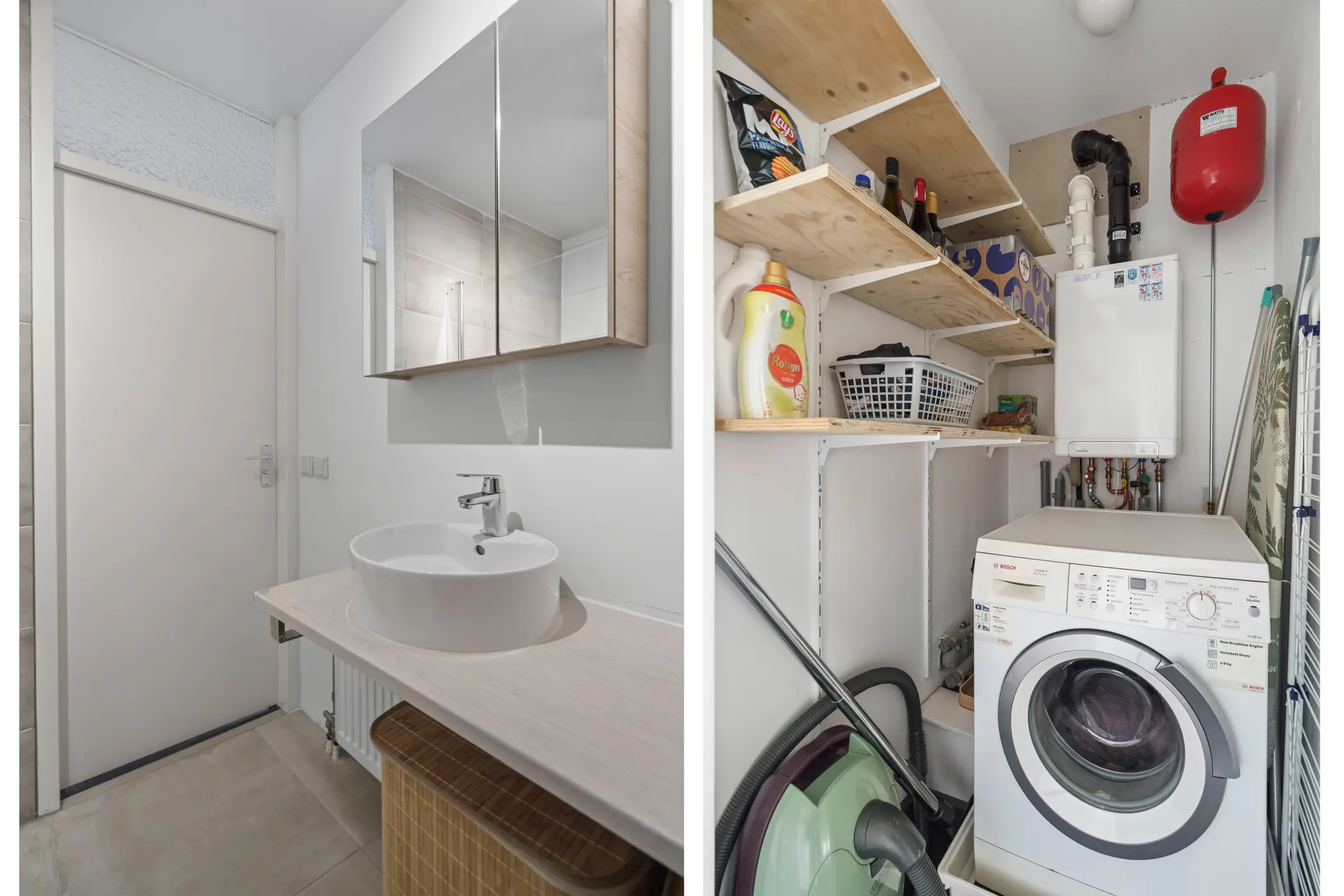 Bij binnenkomst komt u in de hal met meterkast, een separaat toilet met wandcloset en fonteintje en een vaste kast met de cv-ketel en aansluiting voor de wasmachine. Vanuit de hal heeft u toegang tot de badkamer, twee slaapkamers en de lichte woonkamer met open keuken en balkon.