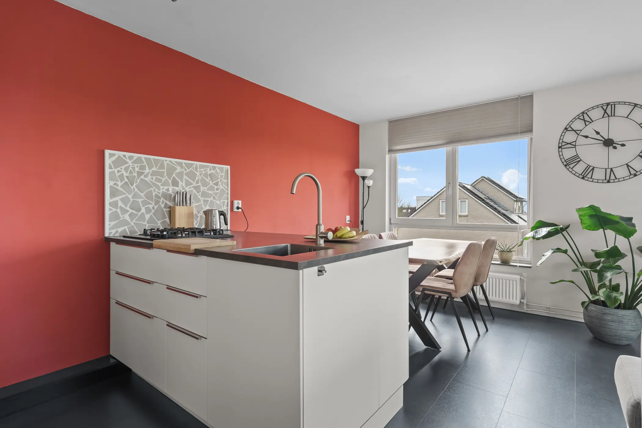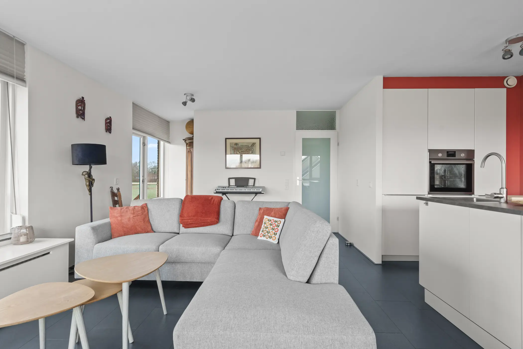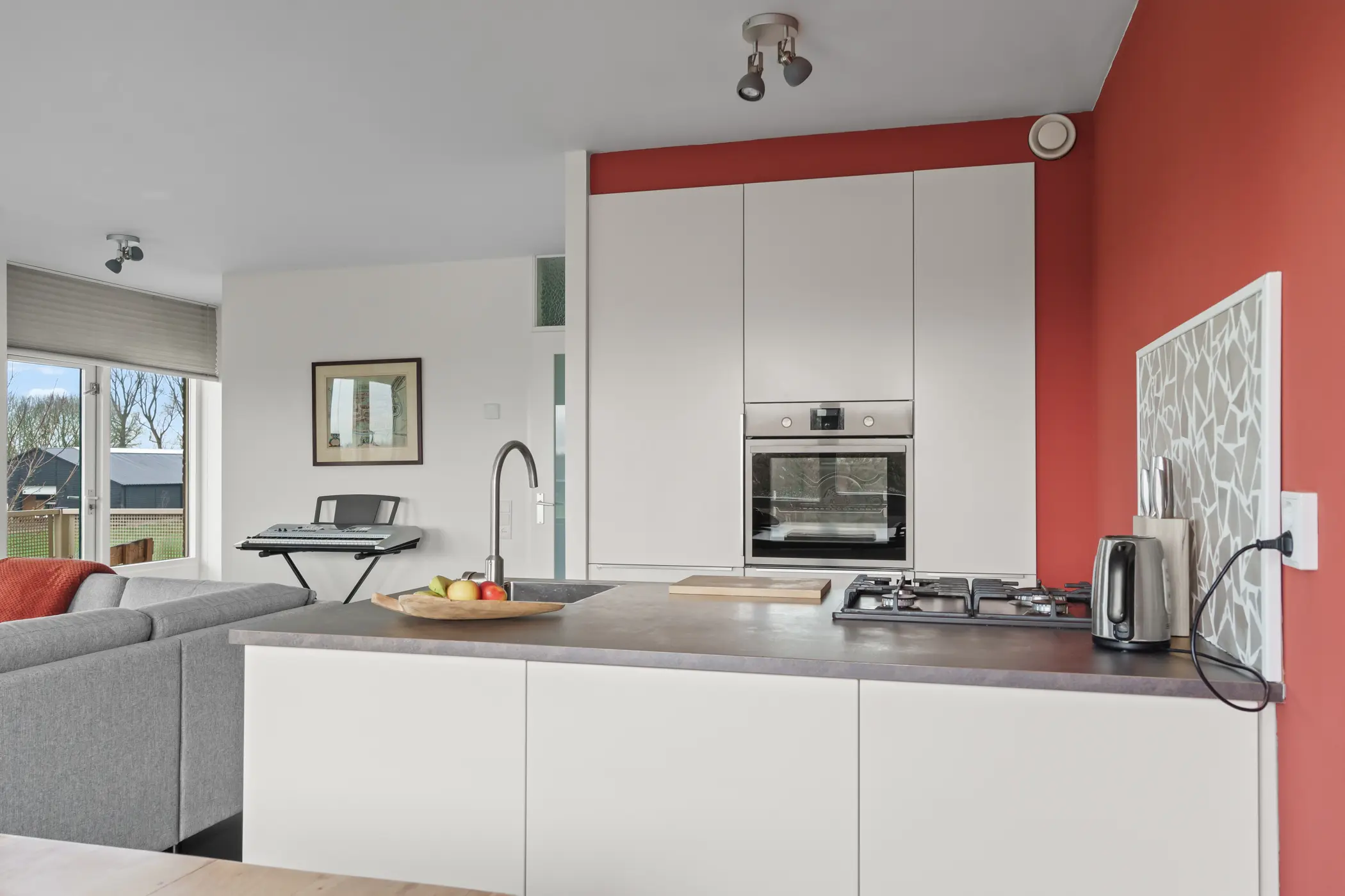 De open keuken is modern ingericht en beschikt over een kook- en spoeleiland met veel bergruimte aan beide zijden. Verder is de keuken voorzien van diverse inbouwapparatuur, waaronder een 4-pits gasfornuis, oven, koel-/vriescombinatie en vaatwasser. De woonkamer is netjes afgewerkt met een laminaatvloer en strak gestuukte wanden.