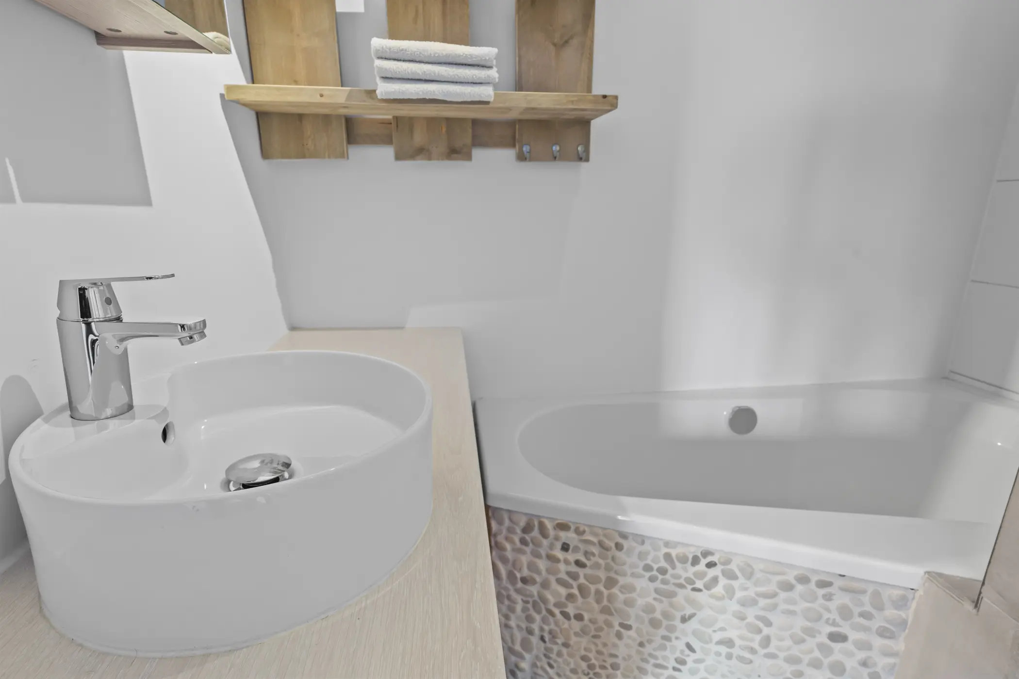 Het appartement beschikt over twee comfortabele slaapkamers. De lichte, moderne badkamer biedt alles voor ontspanning en gemak, met een ligbad, een douchehoek en een wastafel.