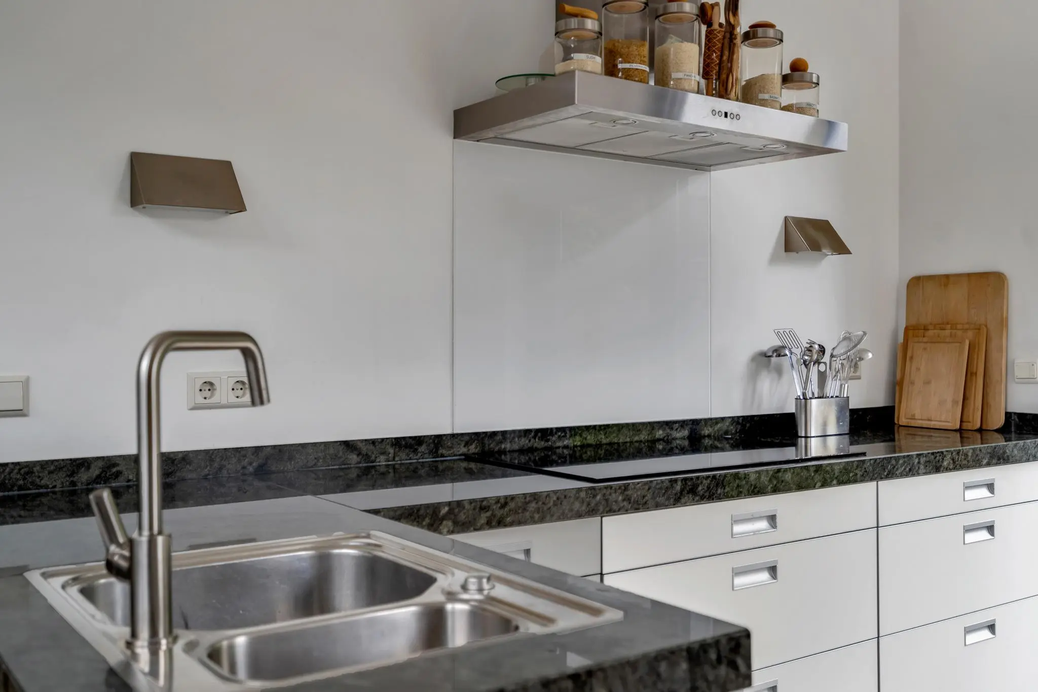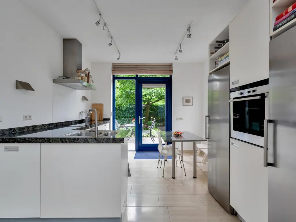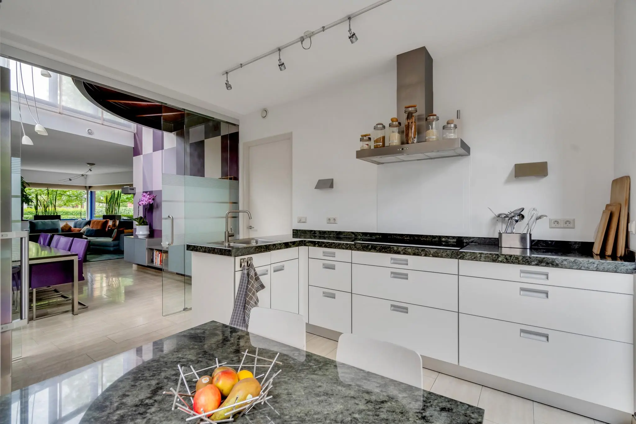 De woning beschikt over een royale, lichte keuken met stijlvolle glazen schuifdeuren. Deze moderne leefkeuken is volledig uitgerust met hoogwaardige inbouwapparatuur, waaronder een inductiekookplaat, een vaatwasser, een ruime koelkast, een aparte vriezer en een combi oven/magnetron – ideaal voor wie houdt van koken in stijl en comfort.