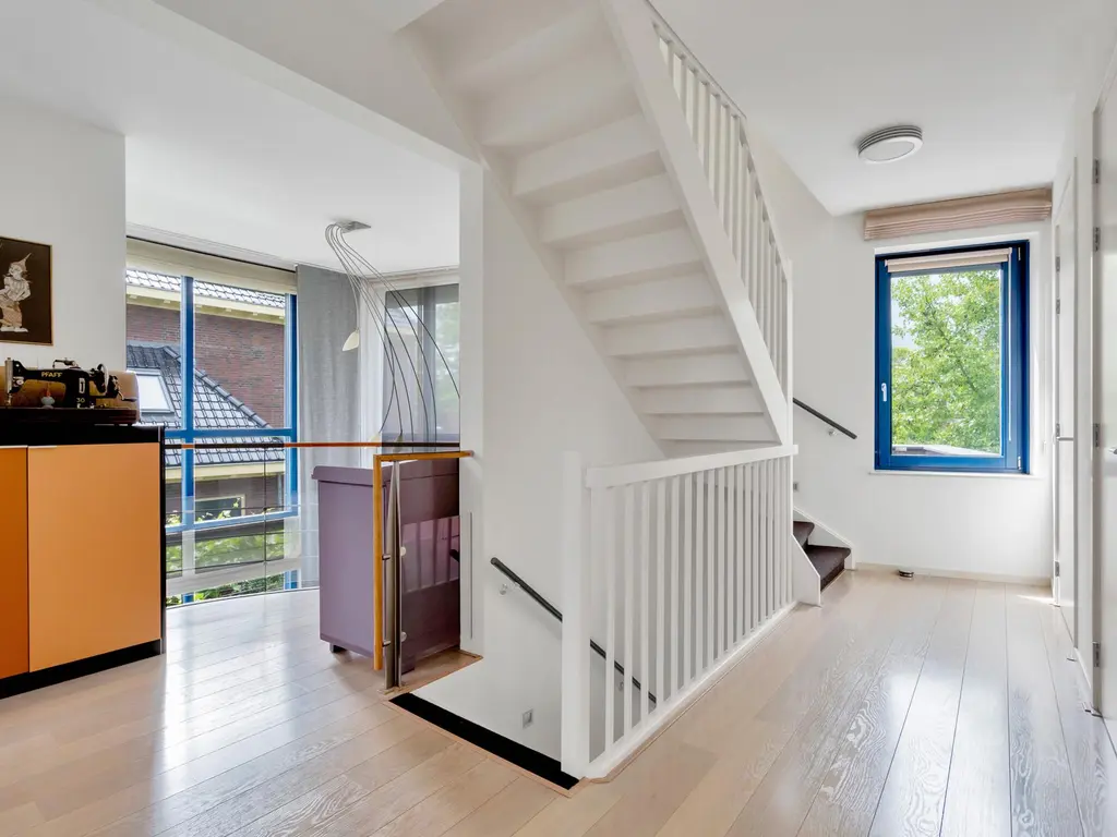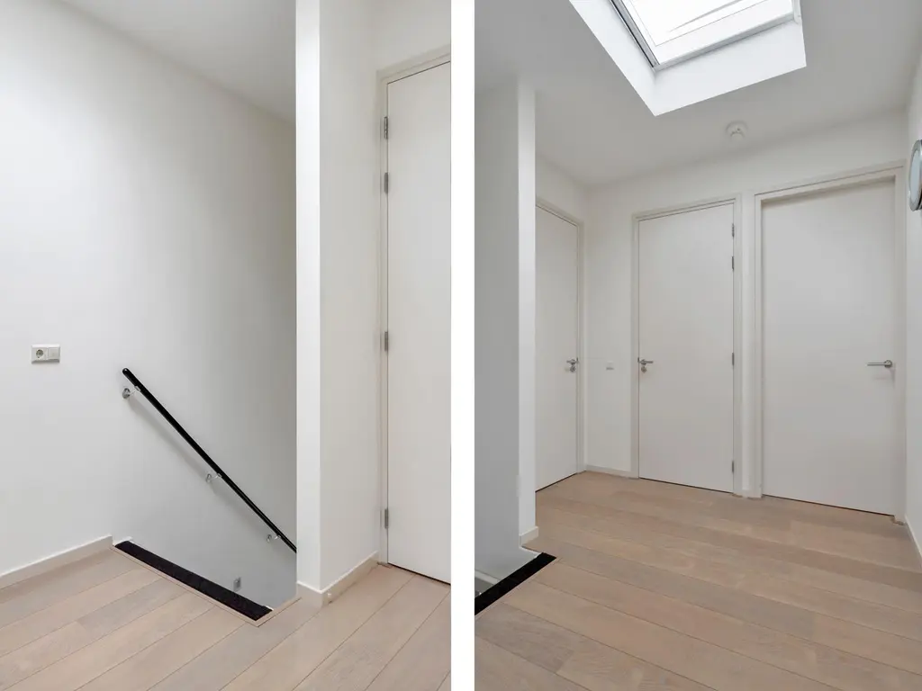 Via de ruime overloop met vide heeft u een prachtig uitzicht op de ondergelegen woon- en eetkamer, wat zorgt voor een open en ruimtelijk gevoel.