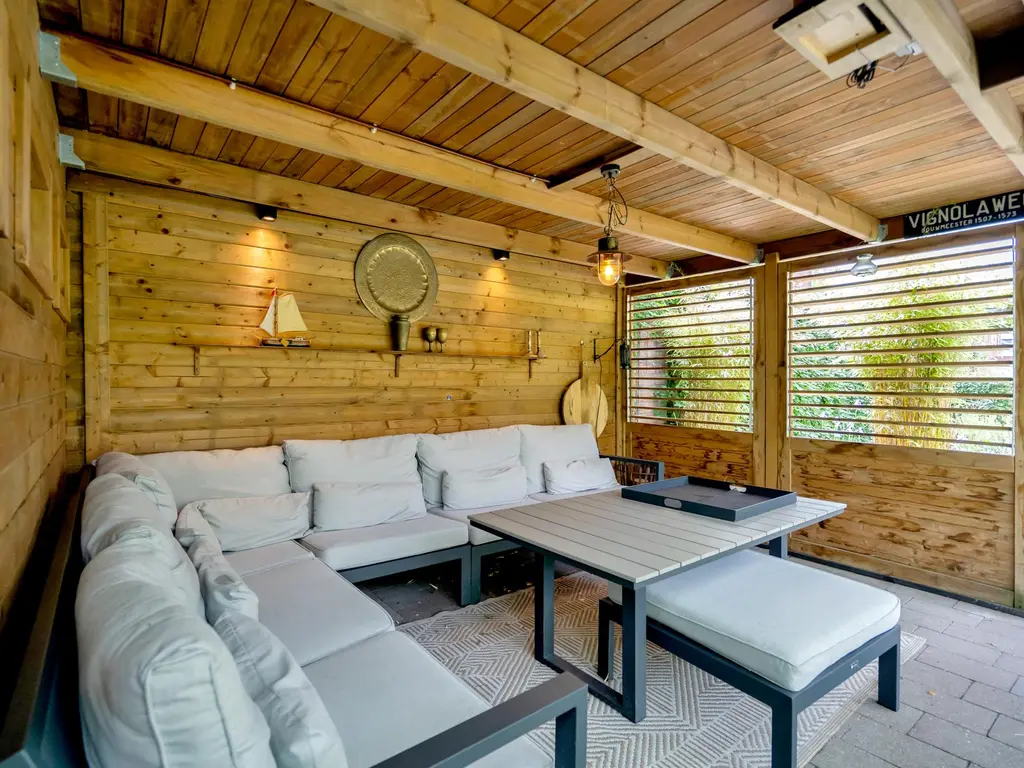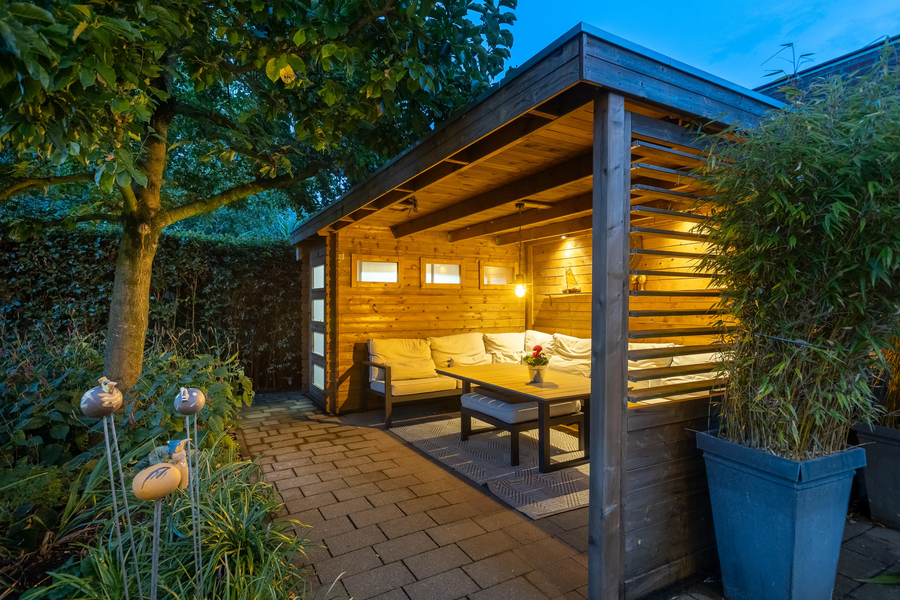In 2020 is een stijlvolle overkapping geplaatst, waaronder je het hele jaar door beschut kunt genieten van het buitenleven. In de tuin zijn meerdere zitplekken, zowel aan de voor- als achterzijde en zijkant van de woning, zodat je op elk moment van de dag kunt kiezen voor zon of schaduw.